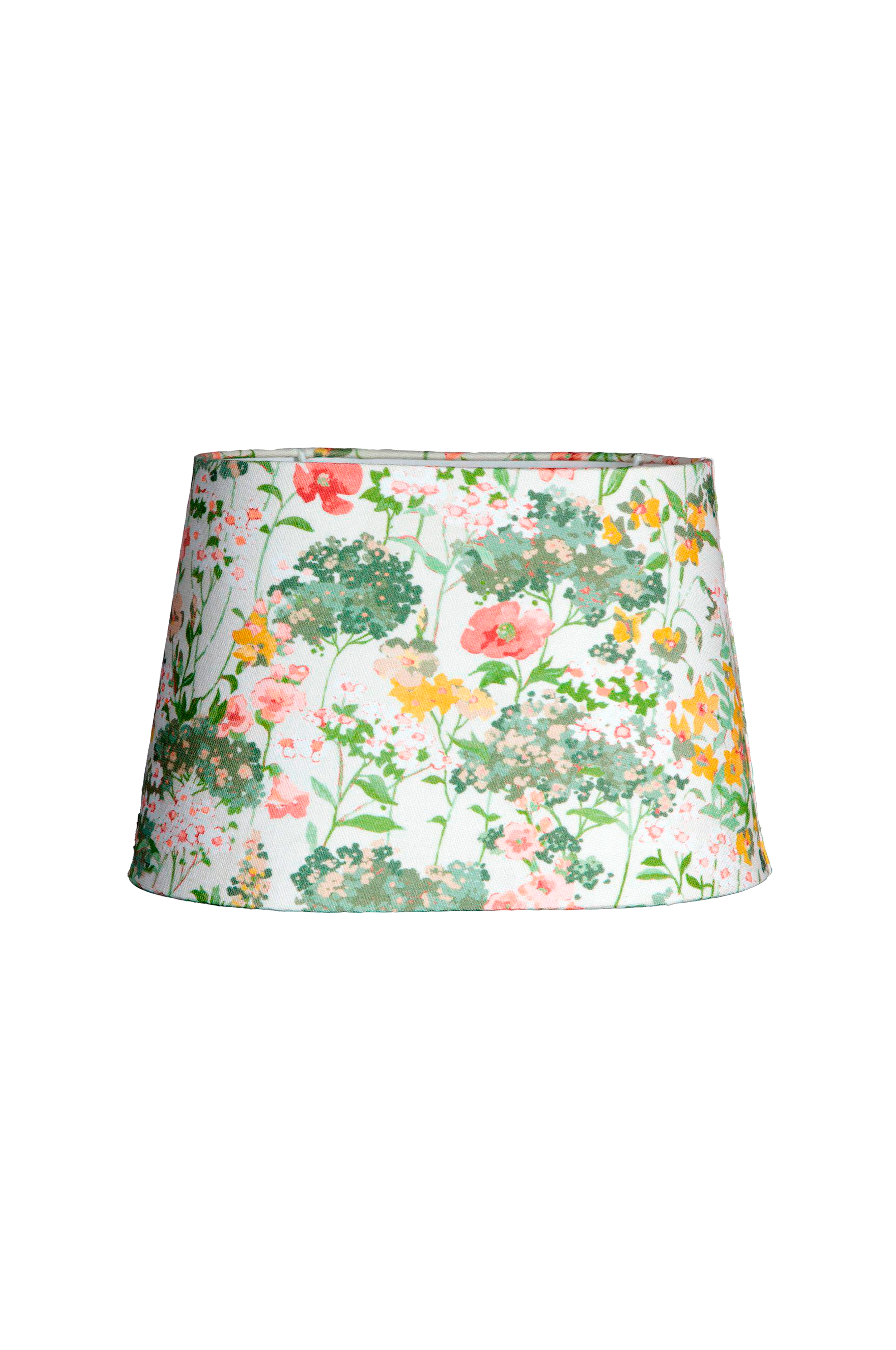omera lampeskærmen har et klassisk mønster af sommerblomster i harmoniske farver, hvilket gør den velegnet til både traditionel og landlig indretning. Den ovale form med et let tilspidset design gør den ideel til smalle rum. Den er udstyret med et clip-on-beslag, der sættes direkte på pæren.