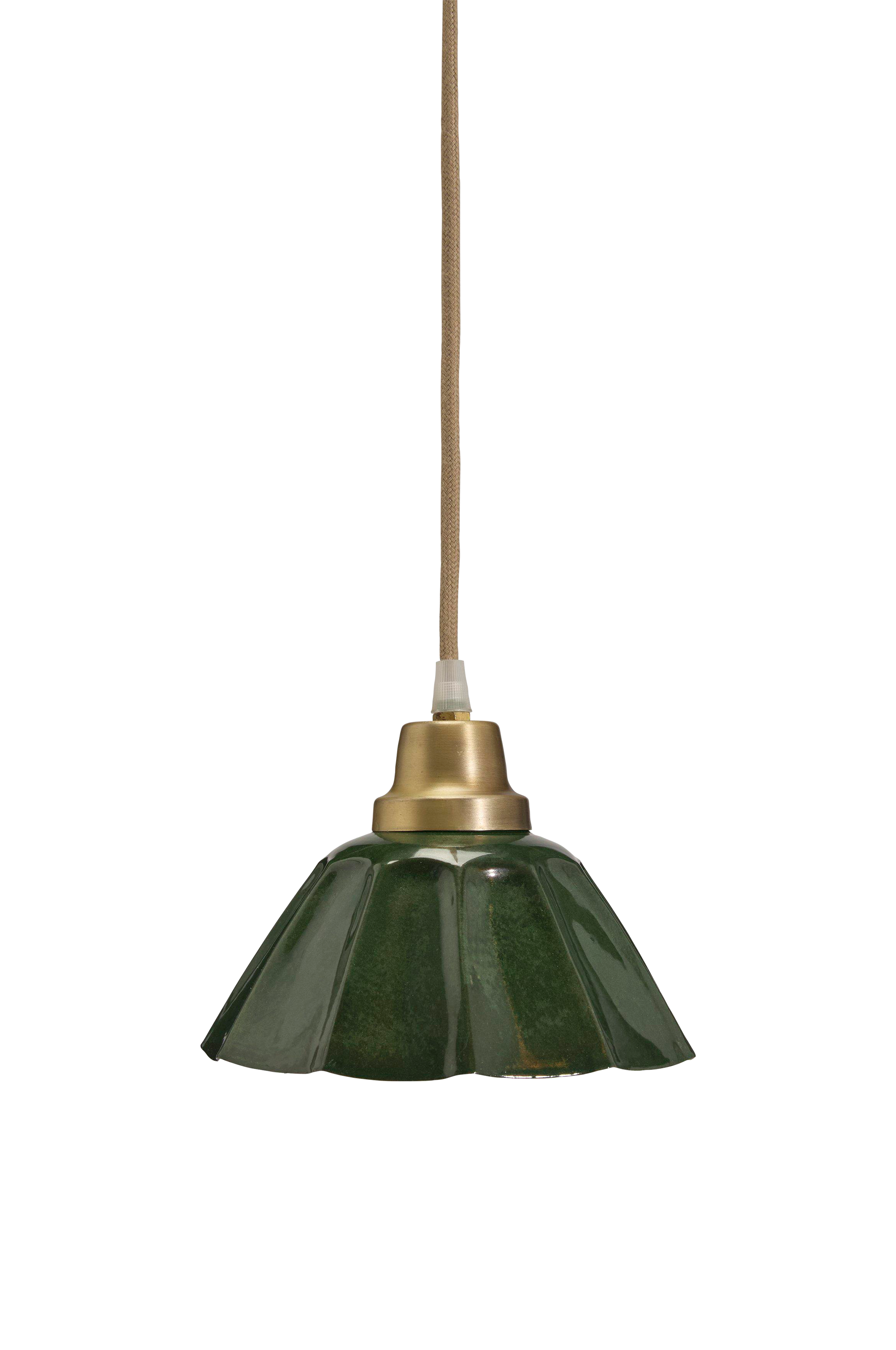Meget smuk lampe, meget mørkegrøn. Godt med lang ledning, men desværre kun almindeligt stik og ikke den type, man normalt bruger til loftslamper.