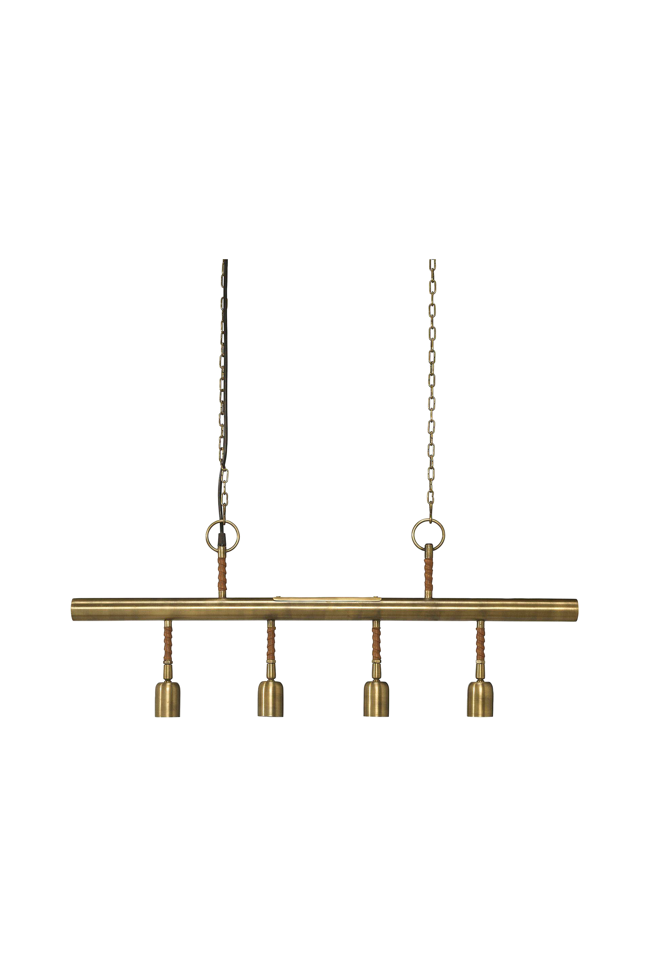Loftlampe Nora af metal i antikmessing med bånd i imiteret læder viklet omkring stellet. En stilren loftlampe med 4 justerbare fatninger. En kæde med baldakin til krogophængning og sort plastledning, den anden kæde har krog. Kædelængde ca. 90 cm. Samlet højde ca. 130 cm ekskl. lyskilder. Passer godt over et spisebord eller køkken. 4 x E27 fatning. 4 x maks. 25W. IP20. Jordet. Lyskilder og loftstik medfølger ikke.