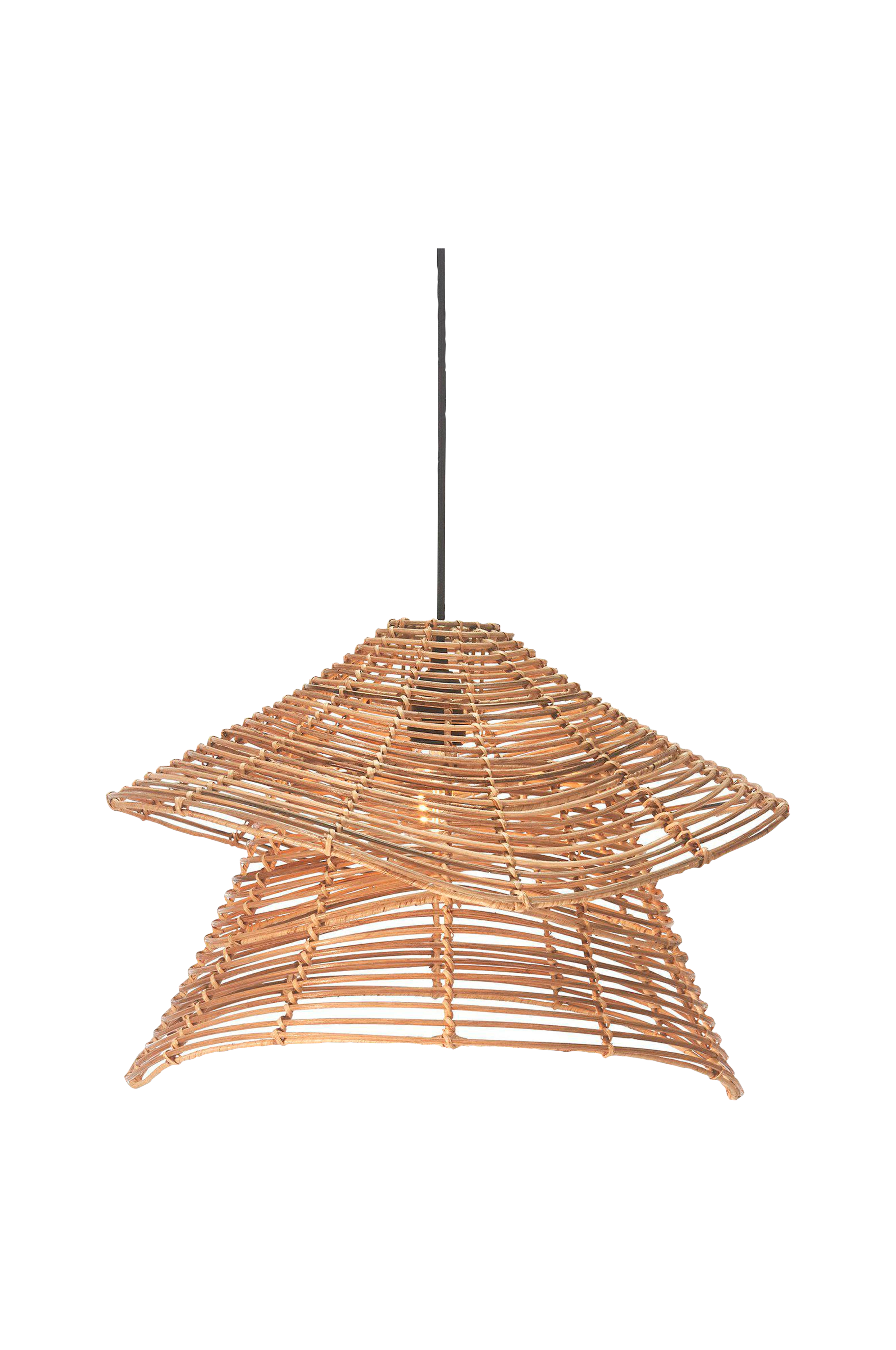 Olga loftlampe i håndflettet naturrotting. Skærmen med sin unikke todelte form filtrerer lyset og skaber et smukt skyggespil. Da den er lavet af naturmateriale, kan der være mindre størrelsesafvigelser, og farven kan ændre sig over tid. Diameter 51 cm, Højde 35 cm. Sort loftophæng med baldakin til indendørs brug medfølger, og ledningen er 1,2 meter lang med en E27 fatning. Brug pære E27 maks. 40 W. Lyskilde og loftkontakt købes separat.