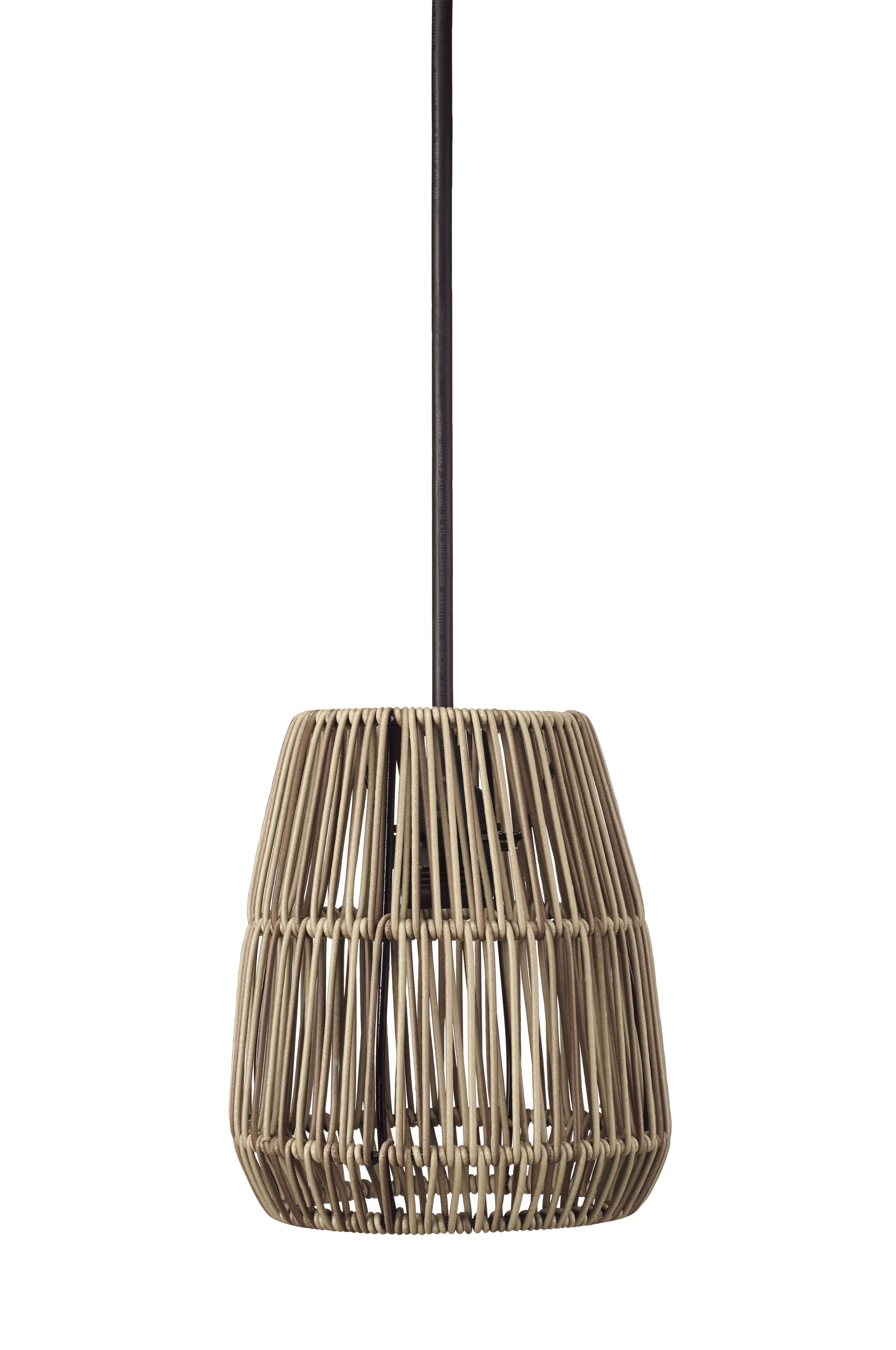 Saigon, en lampeskærm i kunstrotting. Kunstrotting er et robust materiale, som tåler vejr og vind. Den flettede struktur skaber et smukt lysspil. Loftskærmen sælges sammen med sort loftophæng til indendørs brug. 1,2 m med E27 fatning og baldakin til krogophæng. Maks. 40 W. IP20. Lyskilde og loftstik medfølger ikke.
