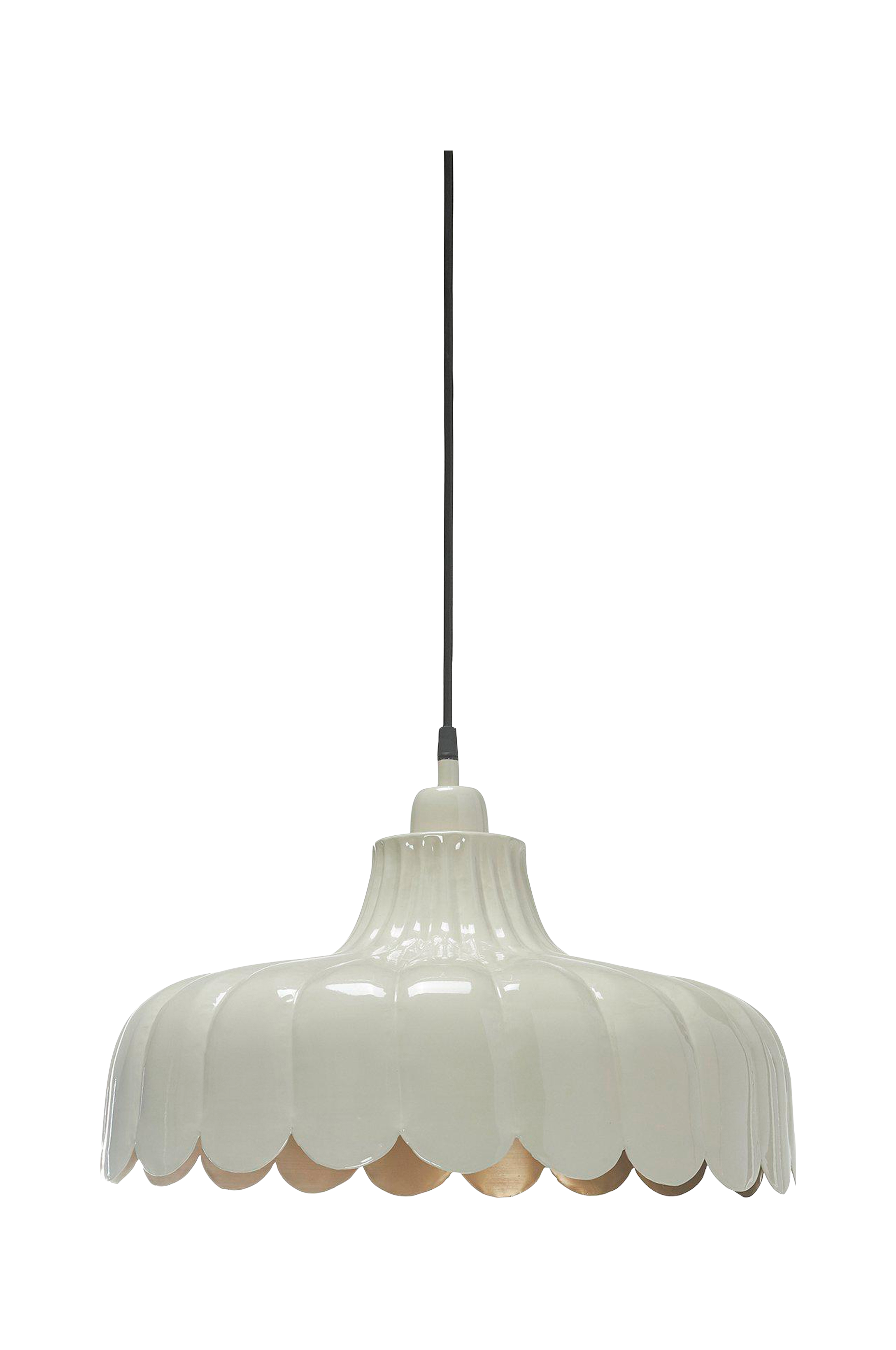 Loftlampe Wells i metal giver et flot, romantisk udtryk i din bolig. Vi er blevet inspireret af en blomst og har skabt denne serie i flere farver og modeller. Alle har guldfarvet inderside som spreder et varmt og skønt lysskær. Hver enkelt skærm er håndlavet. Wells vil pryde dit hjem med sine feminine former og lækre farver. Højde 29 cm og diameter 43 cm. 1,6 meter lang plastledning med baldakin til krogophæng i samme farve som lampen. E27-sokkel. Maks. 25W. Jordet. IP20. Lyskilde og loftstik medfølger ikke.
