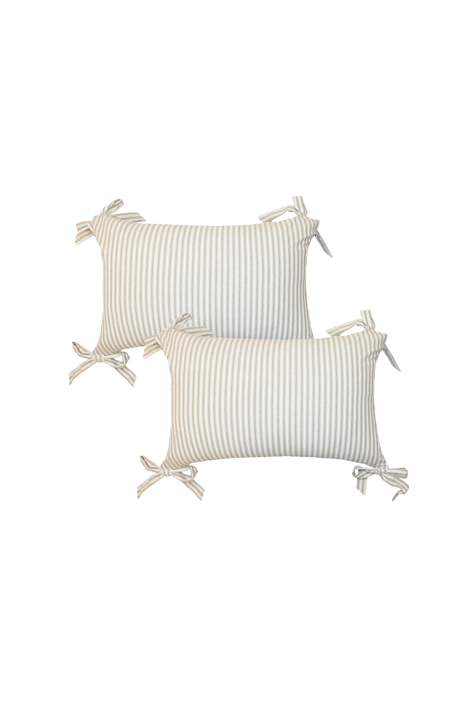 Et nålestribet pudebetræk med fire justerbare hjørnesløjfer, så du selv kan vælge størrelsen på sløjferne. Skjult lynlås i bunden.