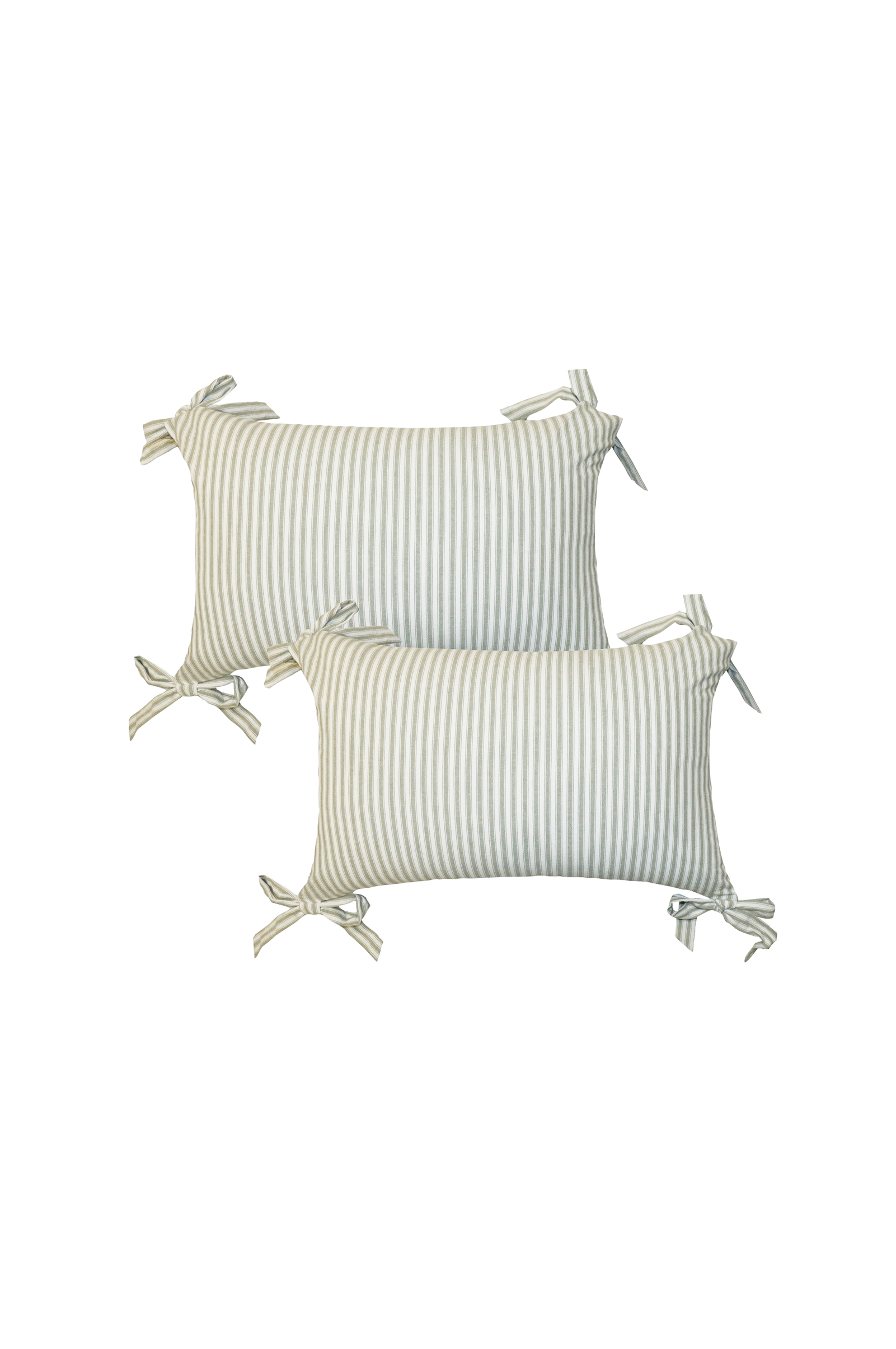 Et nålestribet pudebetræk med fire justerbare hjørnesløjfer, så du selv kan vælge størrelsen på sløjferne. Skjult lynlås i bunden.