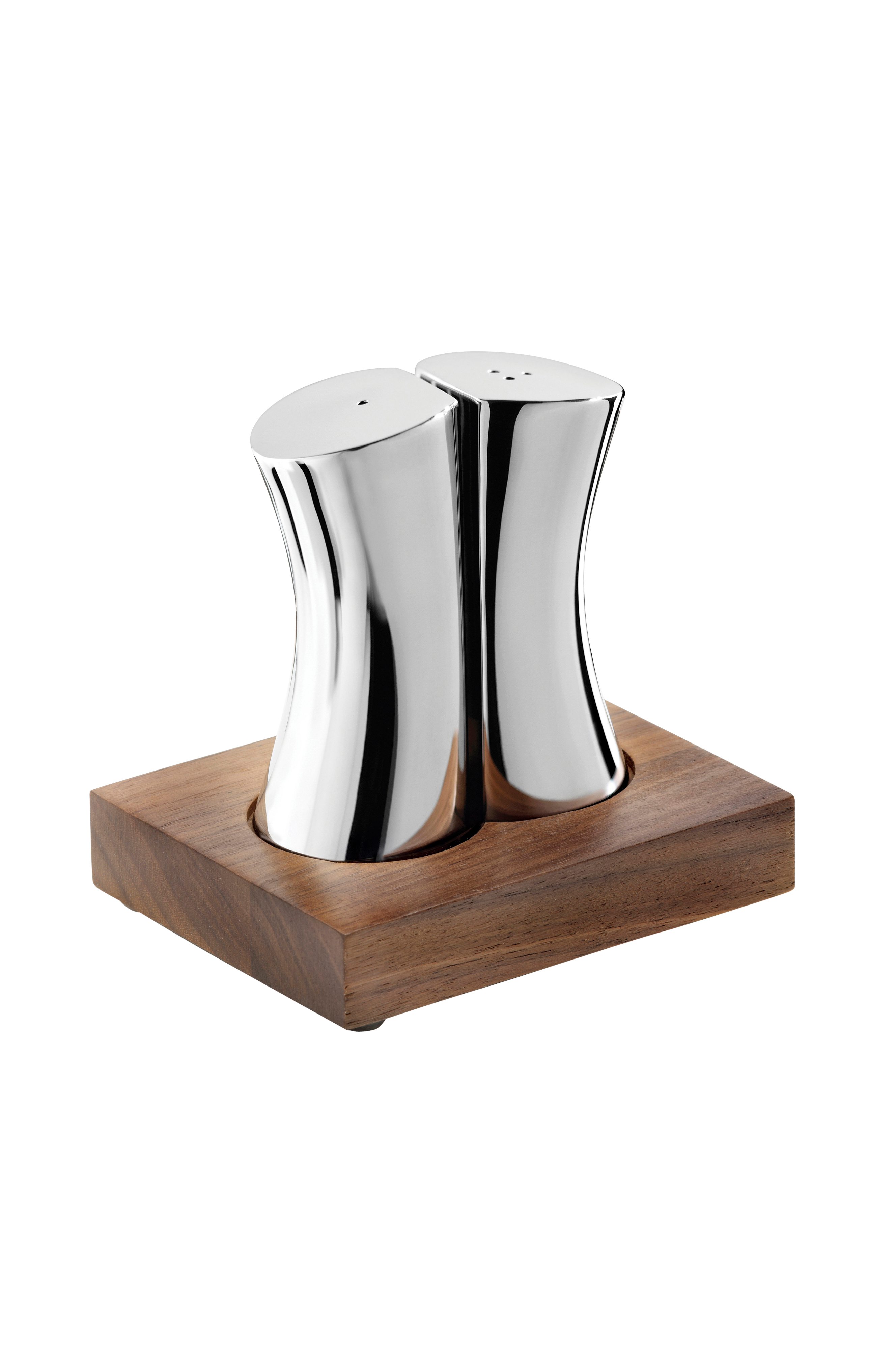 Et elegant designet salt og peber sæt lavet af højeste kvalitet 18/10 rustfrit stål med en spejlpoleret finish og en base i olieret valnød som skaber kontrast.