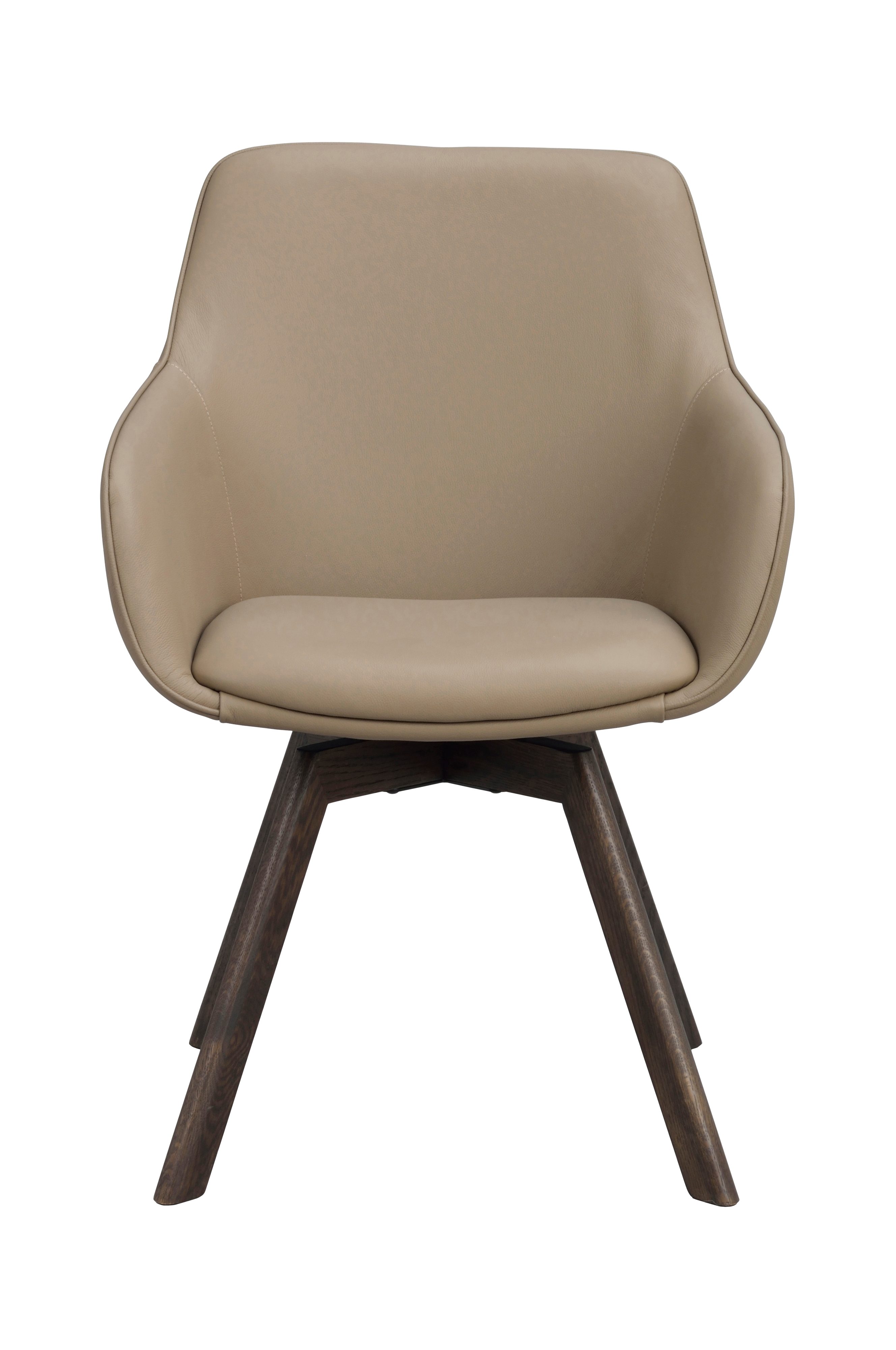Alison-stolen med armlæn i beige læder har, ligesom den populære Alison-stol, en 360 graders drejelig base. Det buede, polstrede sæde og de høje armlæn gør stolen behagelig og hyggelig at sidde i. Alison-stolen med armlæn og træbase gør det nemt at matche den med spisebordet og andre træmøbler i hjemmet. Træet i sædet og den lakerede brune eg-fod er fremstillet af 100 % FSC®-certificeret træ. Sælges kun i 2-pak.