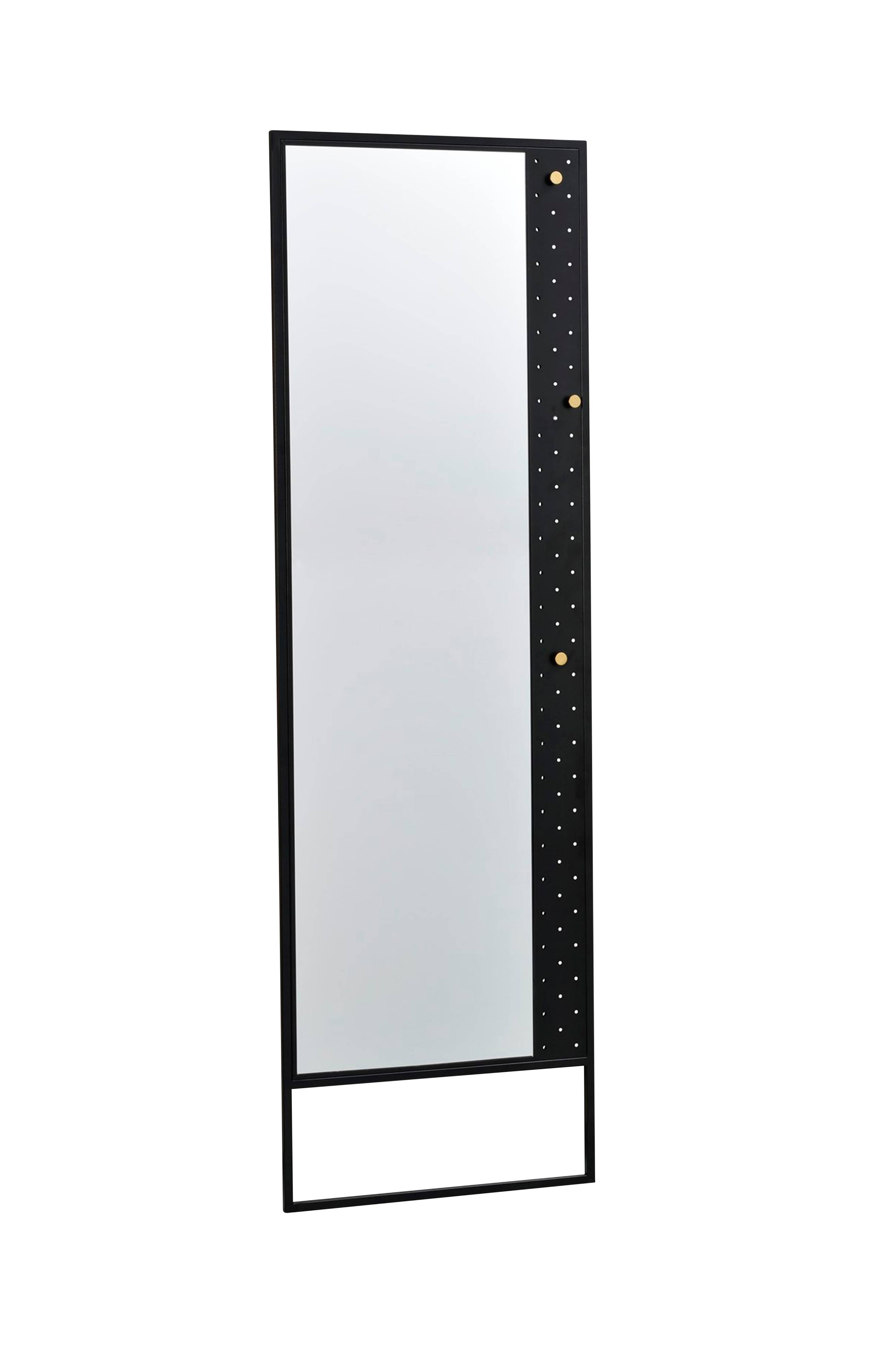 Malone gulvspejl i målene 53x170 cm i sort metal. Malone entréserien består af pulverlakeret metal med sandstruktur og har guldfarvede metalknopper. Gulvspejlet har tre knager, som kan placeres efter ønske. Bredde 53 cm, højde 170 cm, dybde 2 cm. Fastgøres i væggen.