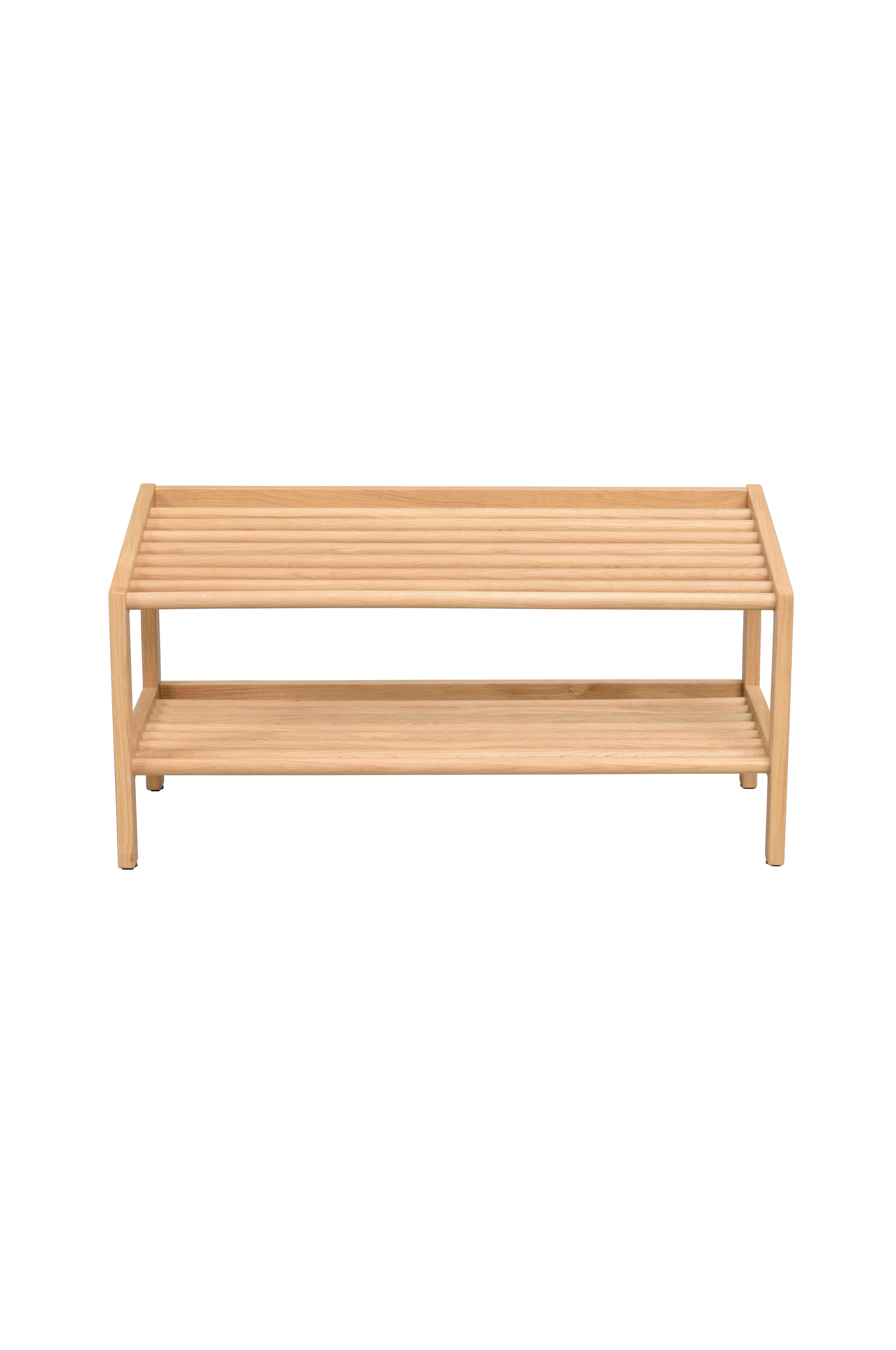 Hillmond skoreol i massiv eg har to hylder, hvor den øverste hylde er let vinklet, hvilket giver skoreolen et unikt og moderne design. Hillmond-kollektionen er synonym med høj kvalitet, smukke trædetaljer og skandinavisk design. Kombinationen af runde former og lige linjer skaber en balance, der er både smuk og funktionel. Du er velkommen til at kombinere skoreolen med andre møbler fra hillmond-kollektionen for en harmonisk stil.