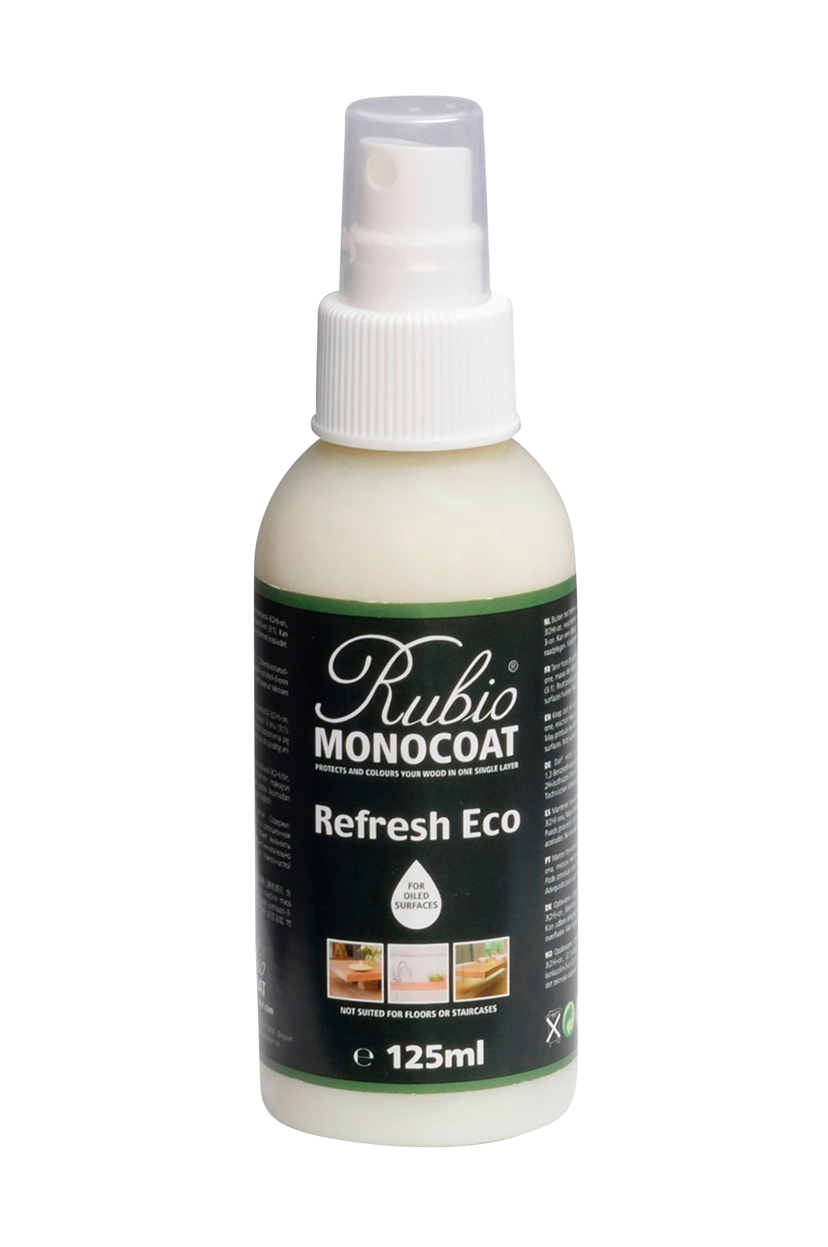 RUBIO Monocoat Refresh Eco 125 ml sprayflaske er et færdigblandet produkt, der opfrisker og restaurerer alle træoverflader, der er behandlet med olie. Pigmentfri emulsion, der kan bruges flere gange om året.
