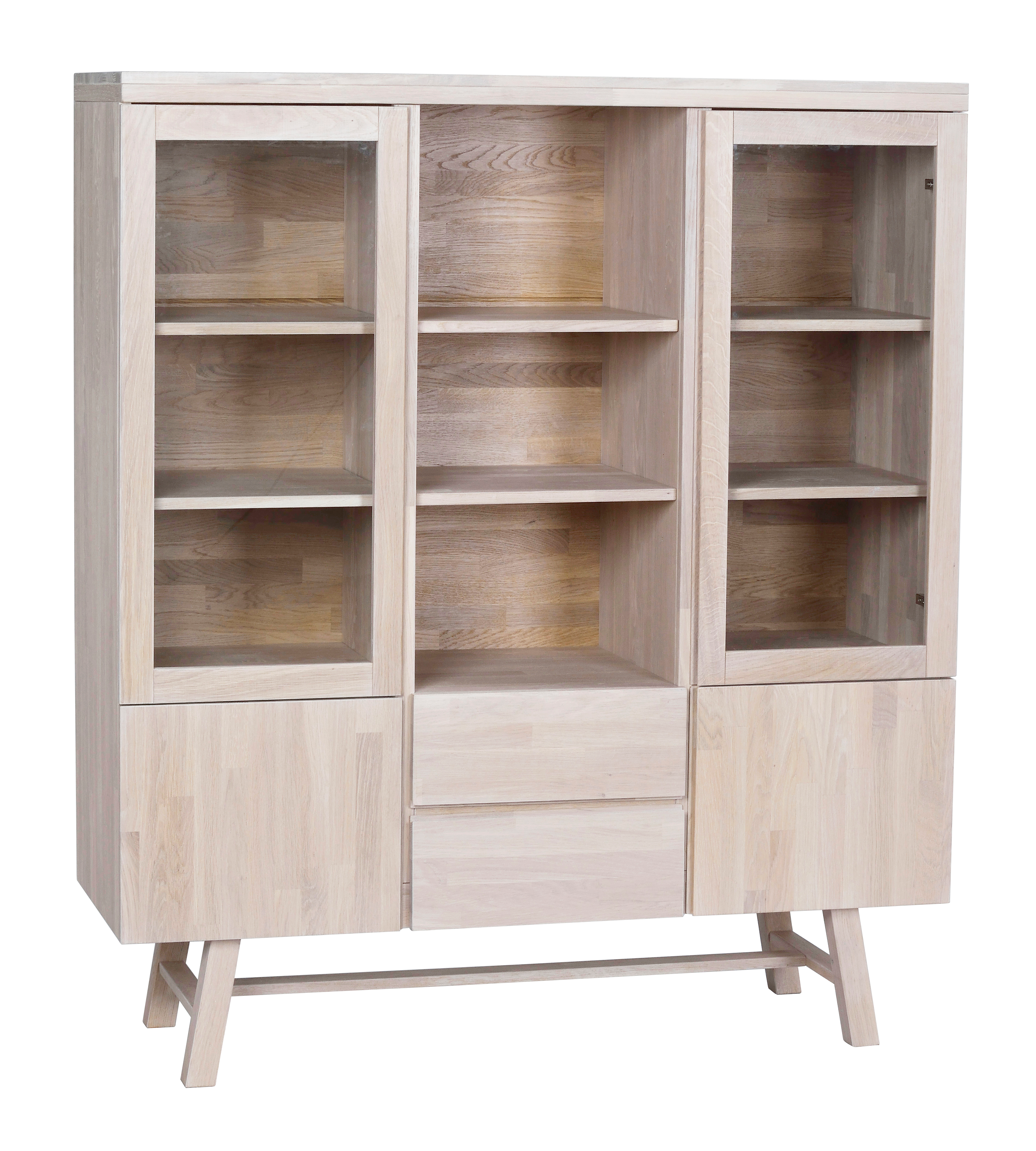 Stilrent skab i skandinavisk design med låger og skuffer med blød lukning. Skab i massiv, fingersamlet eg og let skrå ben. Bredde 130 cm, dybde 45 cm, højde 150 cm. Monter kun ben.