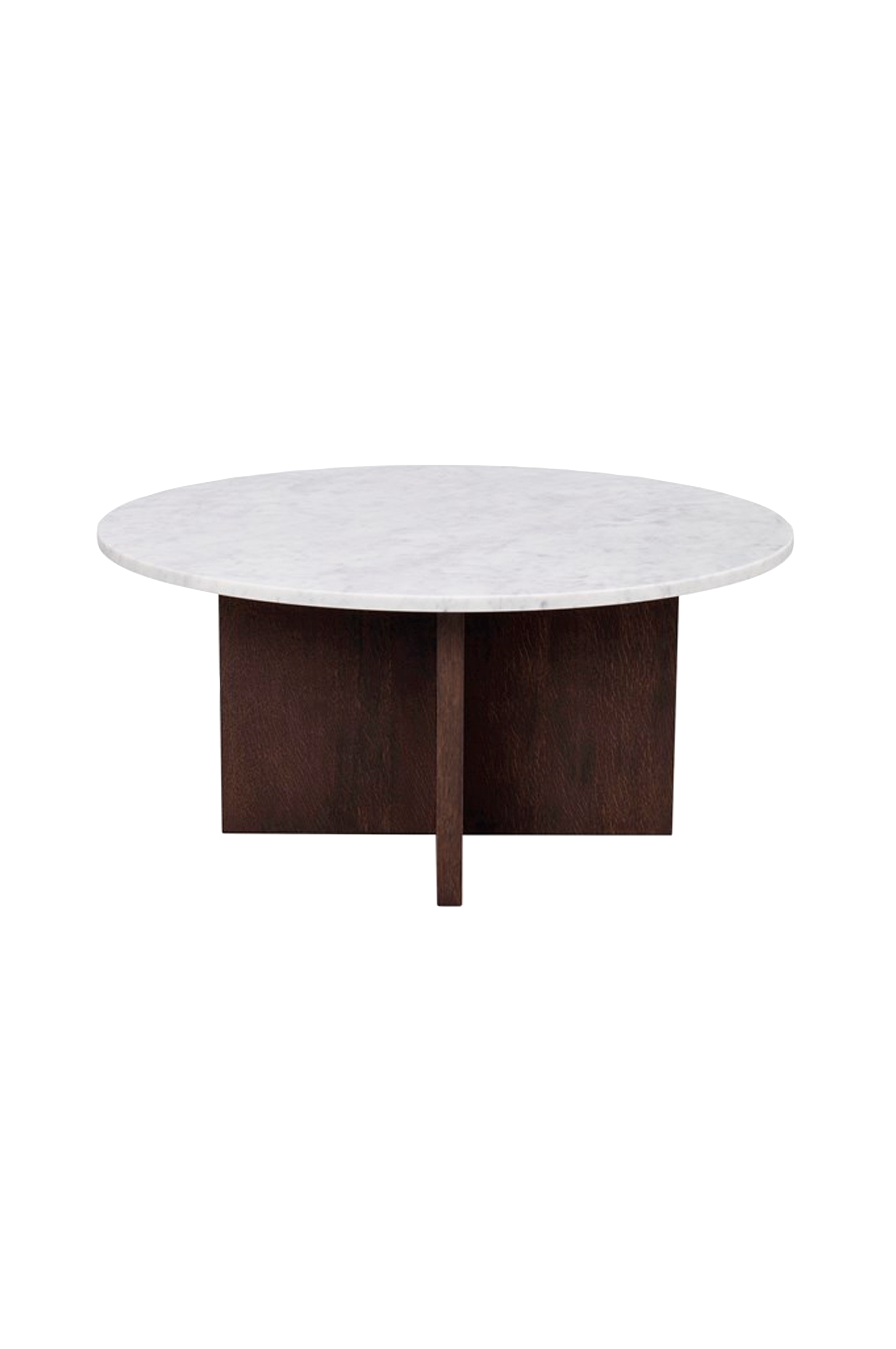 Eksklusivt sofabord Brooksville i Japandi-stil, hvor skandinavisk design møder japansk minimalisme. Den runde bordplade af eksklusivt, hvidt italiensk Carrara-marmor eller brun Emperador-marmor sammen med krydsunderstellet af FSC-certificeret træ giver et slidstærkt sofabord og et roligt udtryk i rummet.