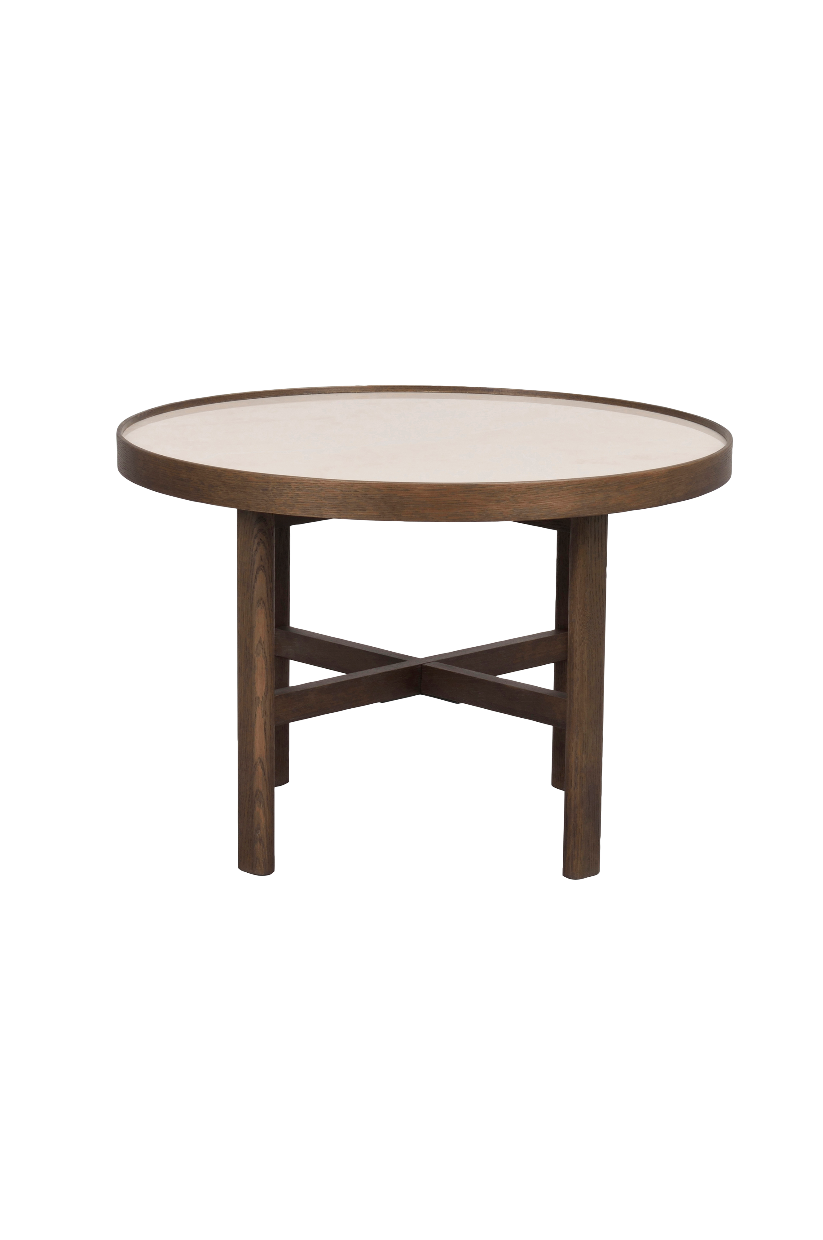 Marsden sofabord, ø60 cm, med en bordplade i blank keramik, bringer en naturlig og elegant atmosfære til stuen. Krydsben i massiv fsc®-certificeret brunlakeret eg kombineret med trækanten rundt om sofabordet skaber en flot kontrast. Desuden er sofabordet modstandsdygtigt over for væsker og ridser takket være det holdbare keramiske materiale. Marsden fås i to forskellige størrelser og kan placeres sammen som indskudsborde for mere fleksibilitet. Fås også i hvidkalket eg.
