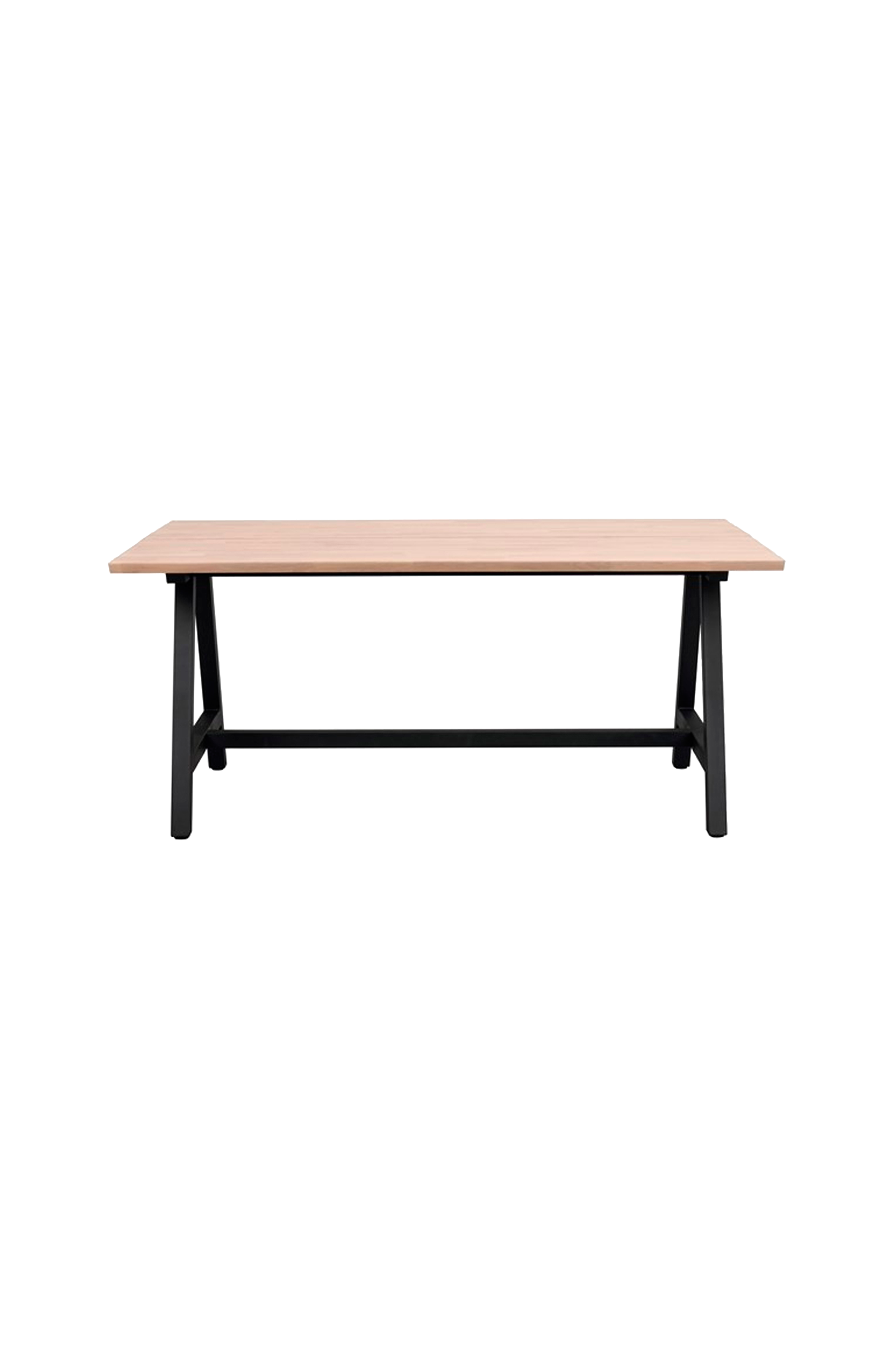Carradale spisebord 170 cm med todelt massiv bordplade i FSC-certificeret eg og V-formede ben i sort pulverlakeret metal. Den stabile benposition giver bordet en sikker følelse. Bordpladen kan suppleres med 1 eller 2 tillægsplader på 50 cm, hvilket kan gøre bordet op til 270 cm langt. Tillægsplader medfølger ikke.