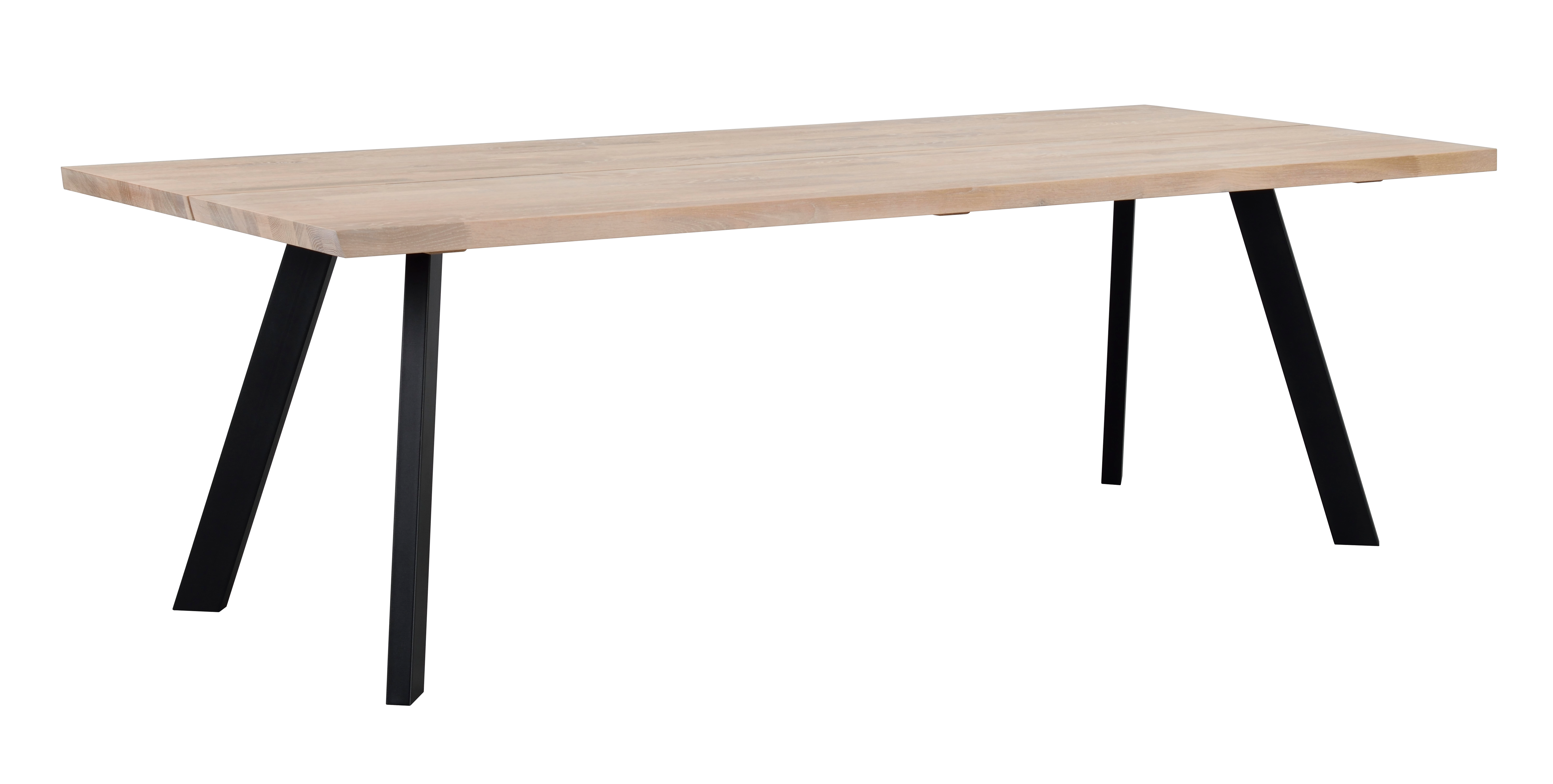 Stort og skønt spisebord i massiv eg. Todelt bordplade i stilrent design. Ben i pulverlakeret sort metal, som er sidejusterbare. Længde 240 cm, bredde 100 cm og højde 75 cm. Leveres usamlet.