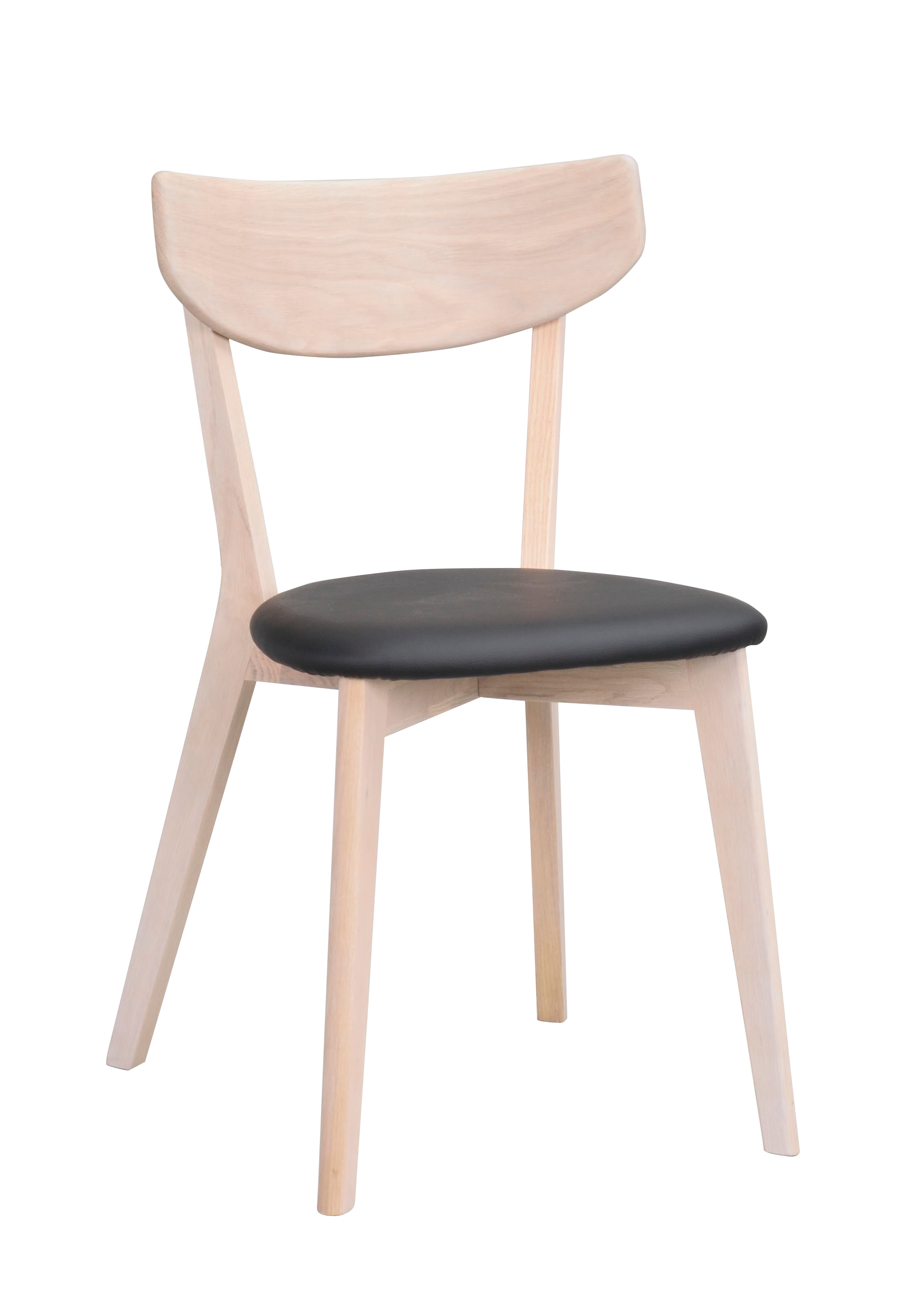 Klassisk træstol med et stilrent rundet design. Beklædt sæde i kunstlæder. Stolens skelet er i massiv eg. Bredde 48 cm, dybde 47 cm, højde 80 cm. Leveres usamlet.