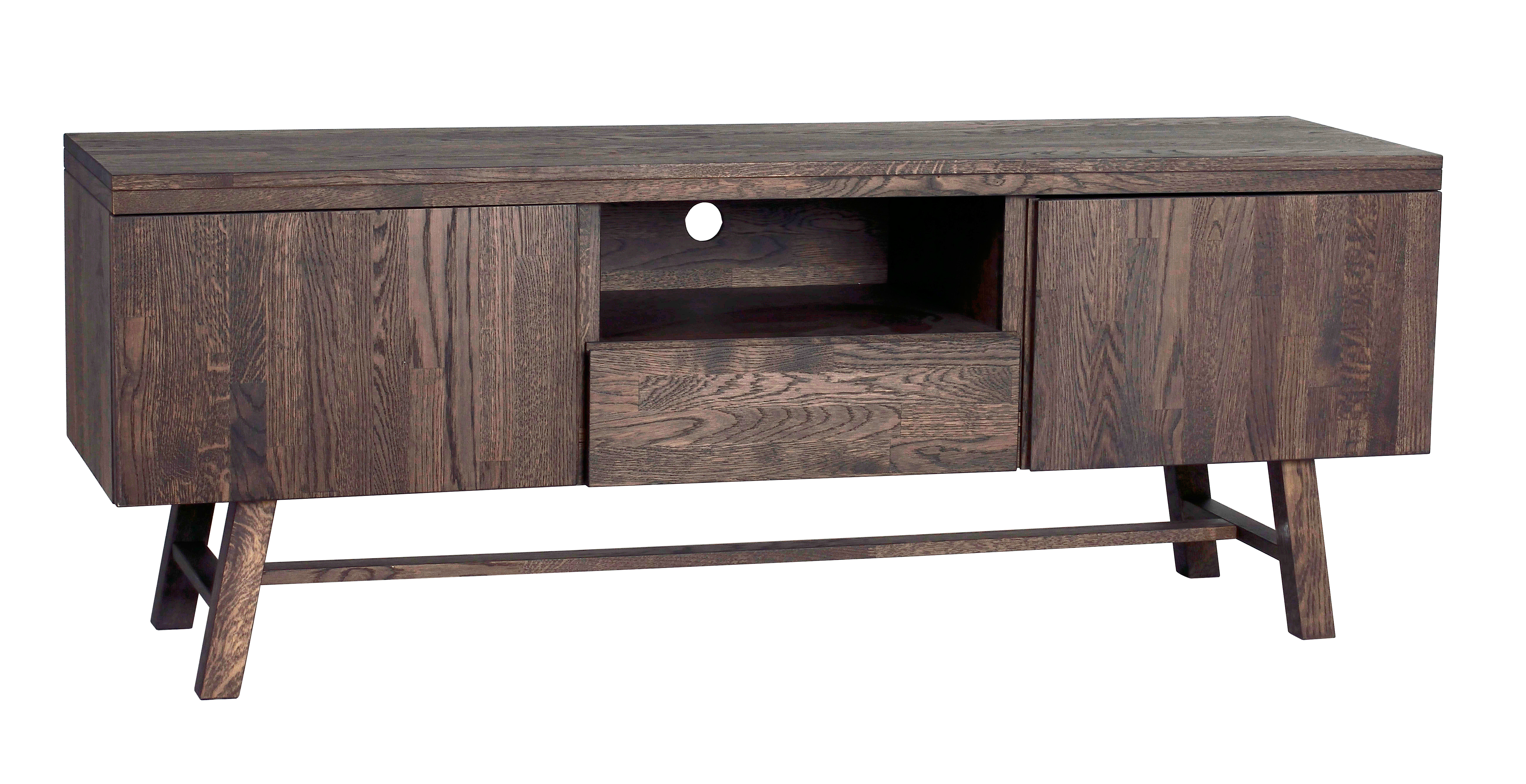Stilren tv-bænk i fingersamlet massiv eg. Praktisk hul til ledninger på bagsiden og skuffer og låger med blød lukning. Bredde 160 cm, dybde 45 cm, højde 60 cm. Monter kun ben.