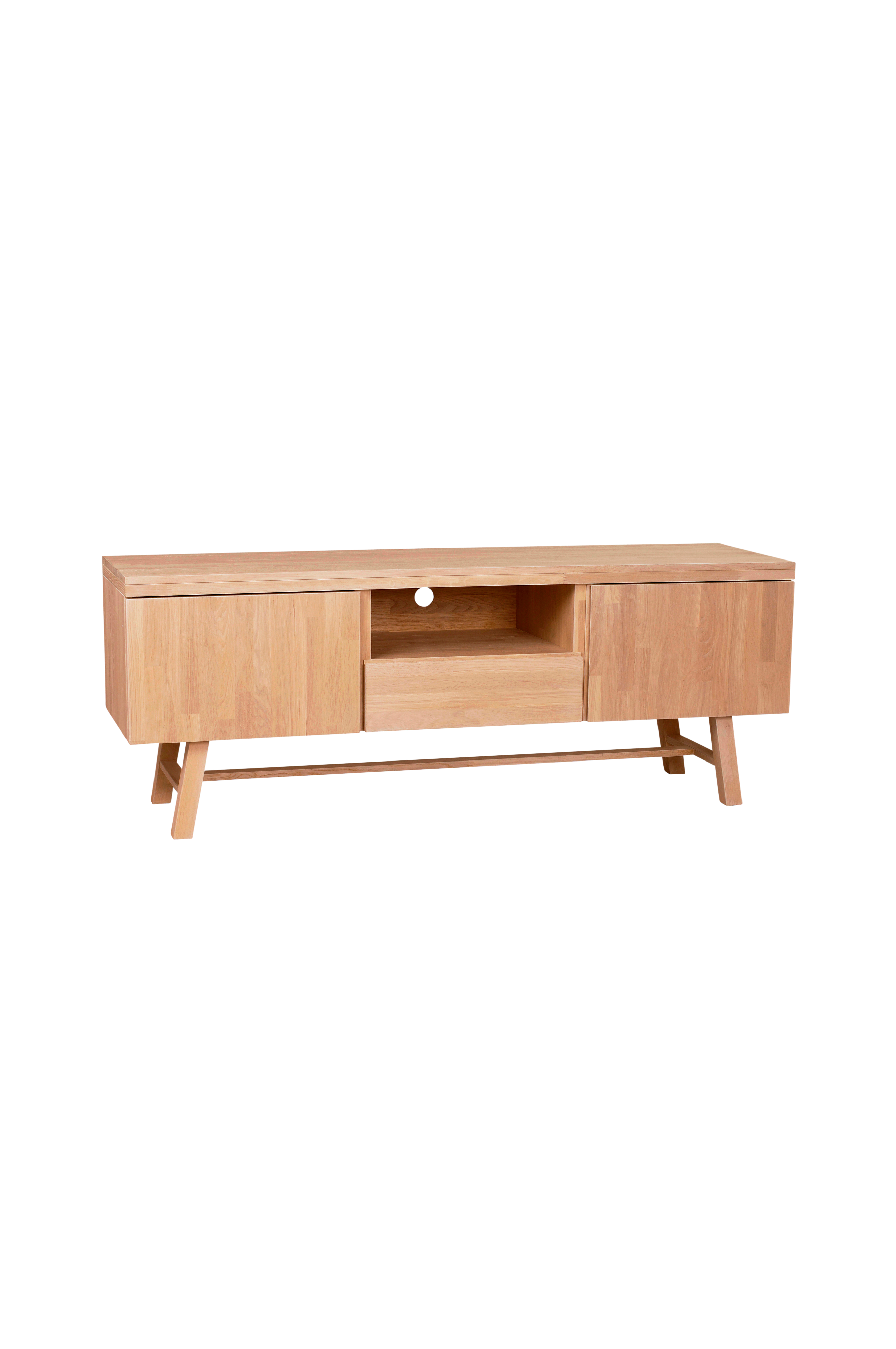 Stilren tv-bænk i fingersamlet massiv eg. Praktisk hul til ledninger på bagsiden og skuffer og låger med blød lukning. Bredde 160 cm, dybde 45 cm, højde 60 cm. Monter kun ben.