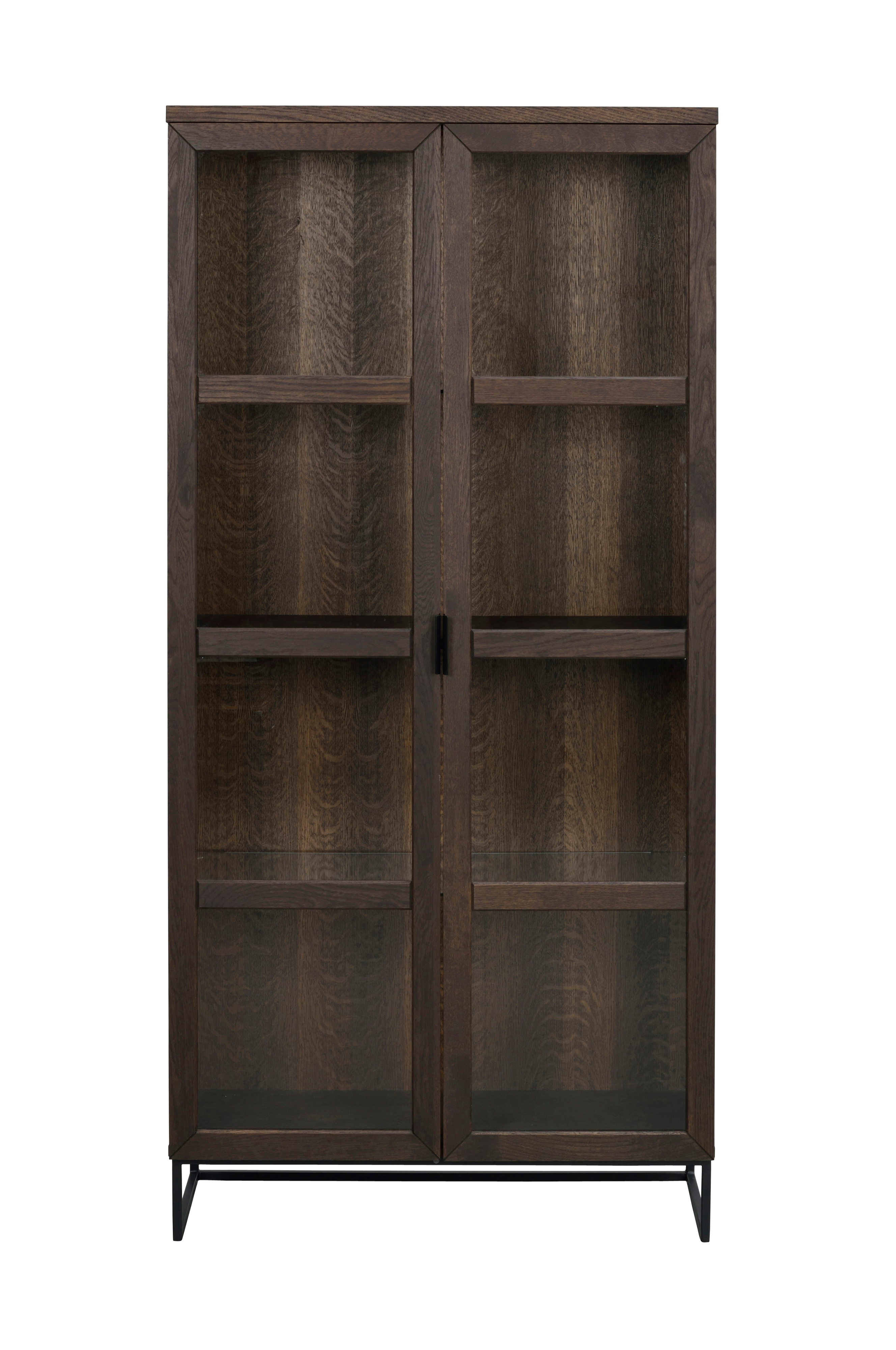 Everett vitrineskab med glaslåger. Bredde 95 cm, dybde 41 cm, højde 195 cm. Skabet er i massiv eg. Flytbare glashylder samt sorte ben i pulverlakeret metal. Flot og stilsikkert vitrineskab som indgår i vores serie Everett.