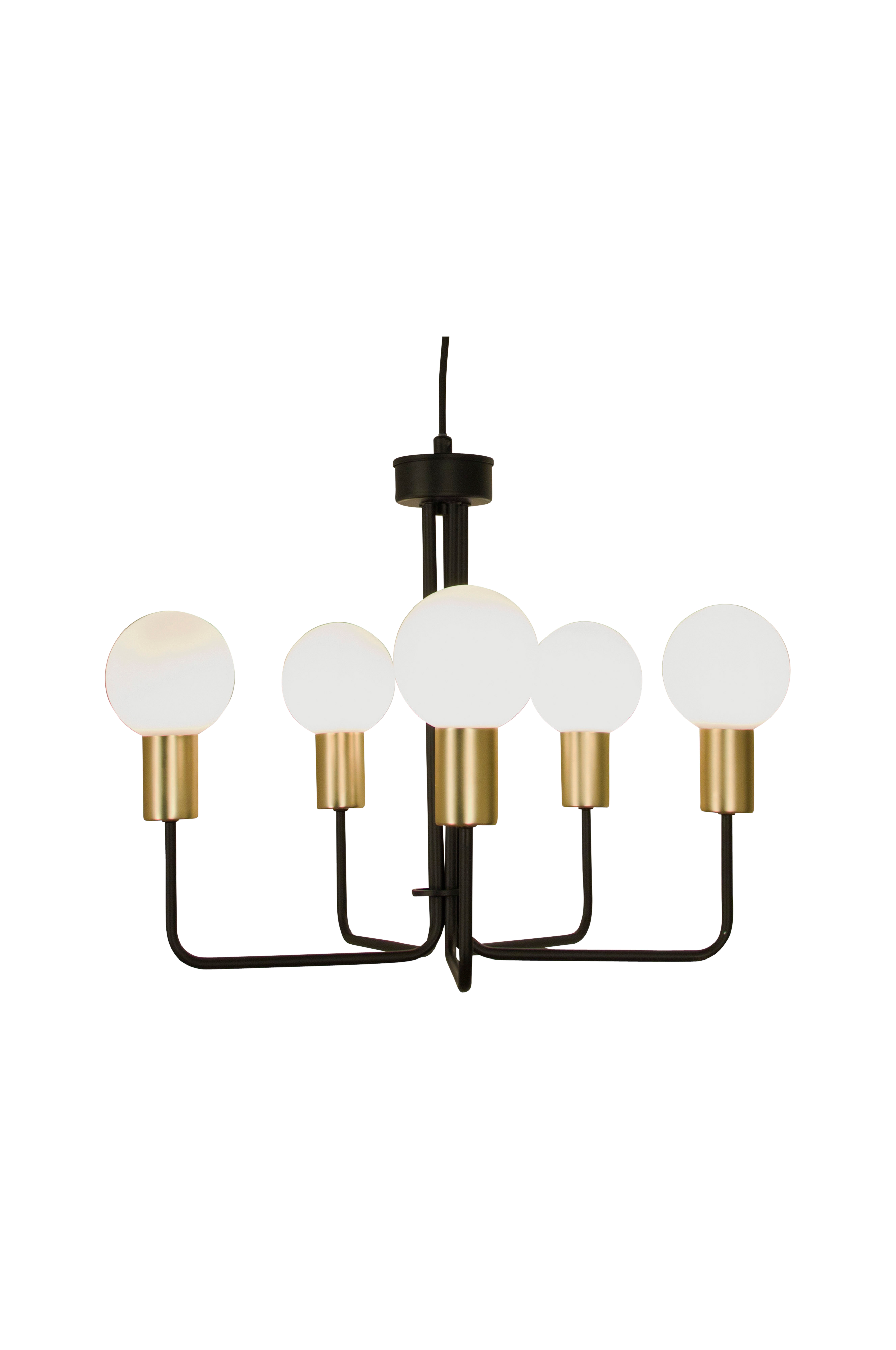 KVINT loftlampe , sort/messing. Glaskupler over pærerne. Lampen monteres på loftkrogen. Metalkroge medfølger. Materiale: metal og glas