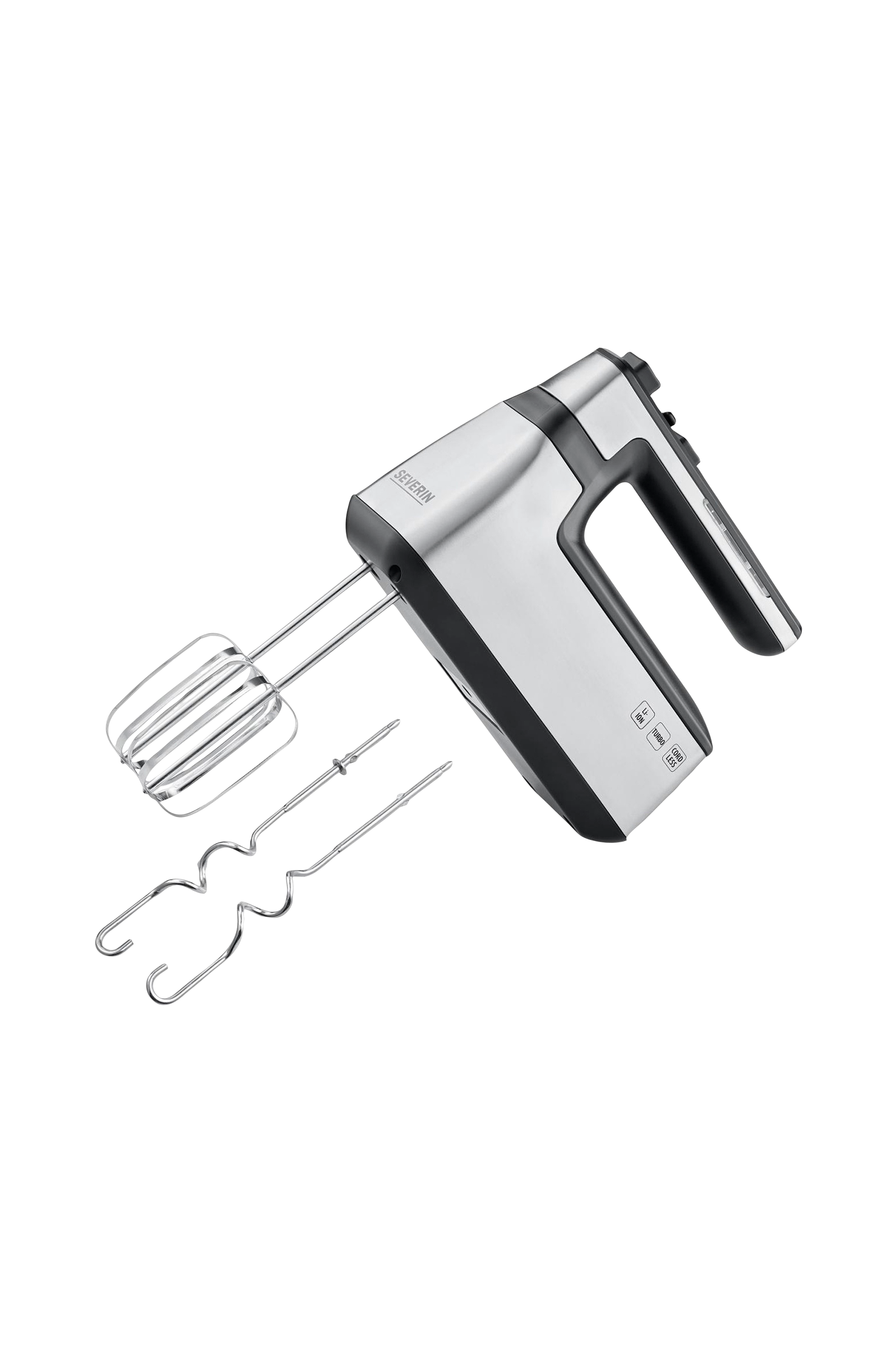 Ledningsfri håndmikser som er perfekt til udekøkkenet eller hvis stikkontakten sidder det forkerte sted. Trinløs indstilling af hastigheden. Der medfølger naturligvis dejkroge.