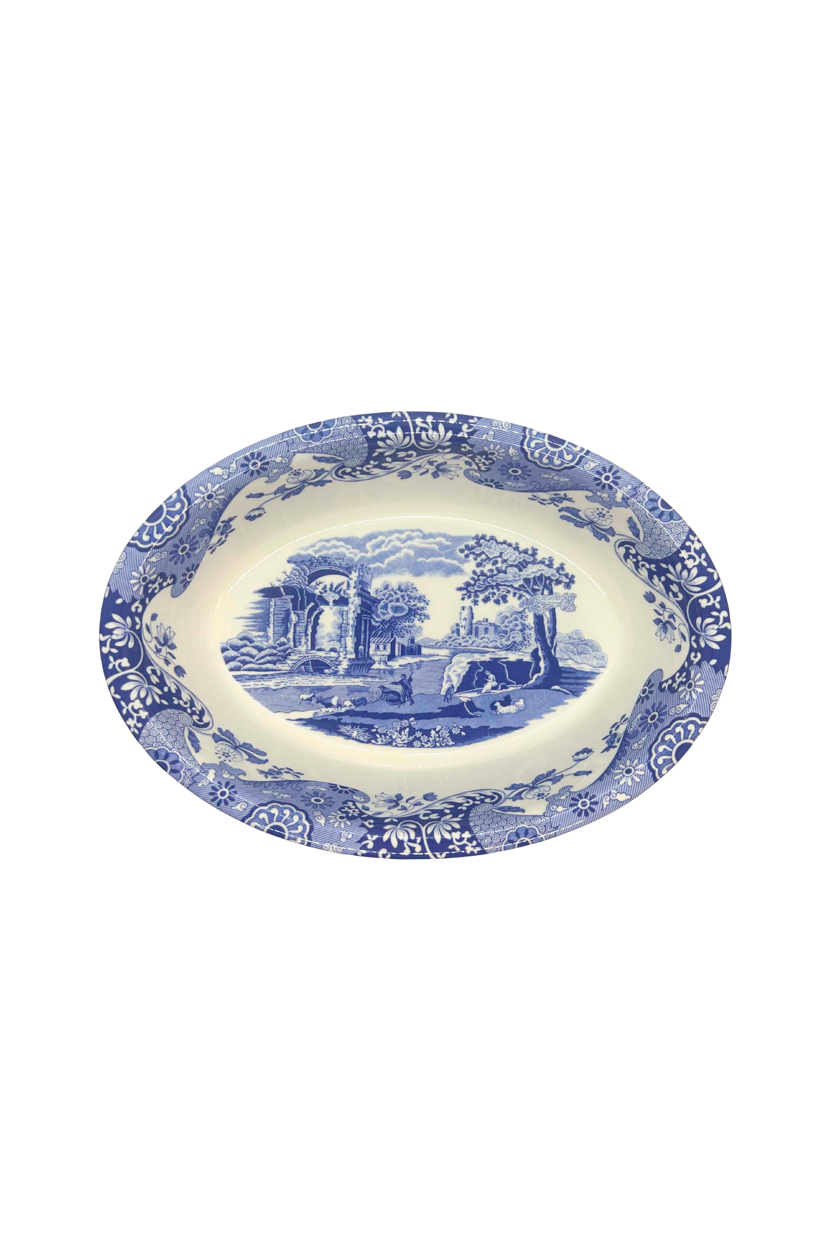 Den ovale fad med kant på 28 cm blue italian er et smukt formet serveringsfad prydet med Spodes berømte landskabsdesign blue. Fadet er fremstillet i Stoke-on-Trent, England, og kombinerer traditionelt håndværk med praktisk funktionalitet, hvilket gør det perfekt til servering af tilbehør eller hovedretter.