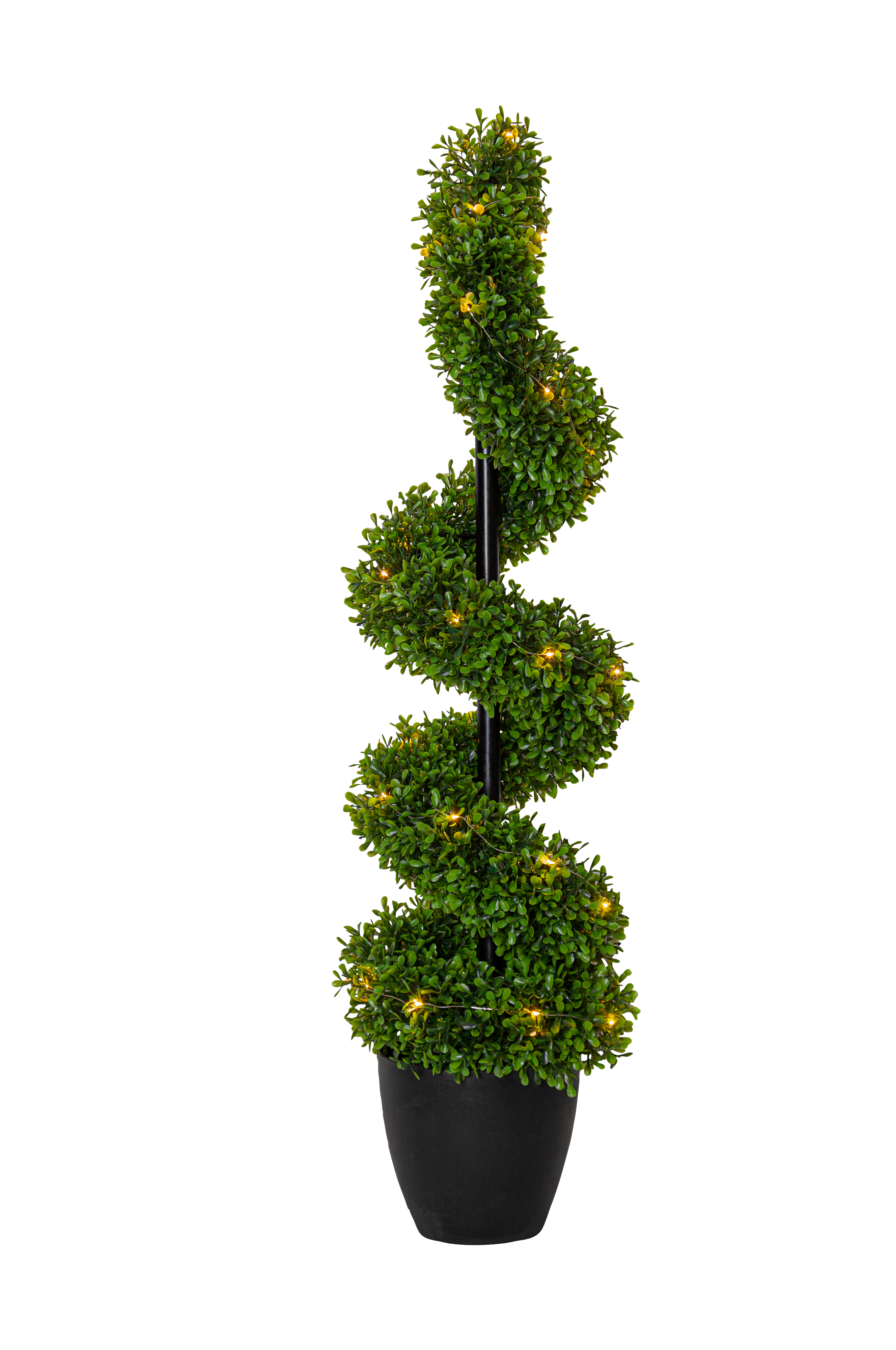 Buksbomsspiral med en højde på 90 cm er en kunstigt formet buksbom lavet af PE plast. Med 30 varmhvide lyspunkter lyser den smukt op og kan bruges som et indbydende træ udendørs eller indendørs i en lobby eller hjemme i en entre. Den er smuk og naturtro og man behøver ikke klippe den hvert år. Den drives af 3 AA batterier og har desuden en timerfunktion og når kontakten er i timerposition lyser træet i cirka 30 dage. Den kan bruges udendørs eller indendørs. Batterier medfølger ikke.