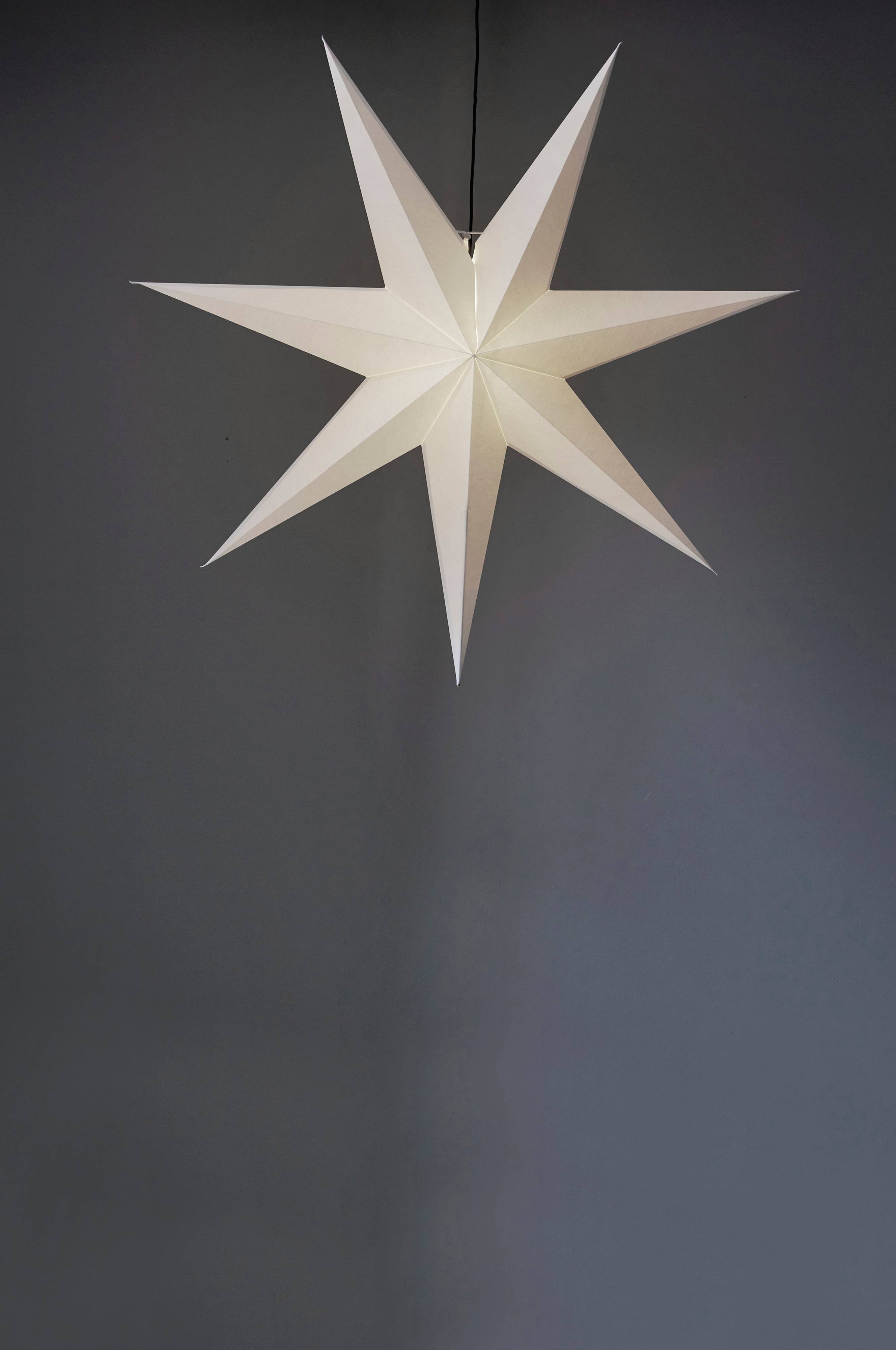 Papirstjerne med sort tekstilledning. En elegant stjerne til dekoration i vinduet. Stjernen har plads til en pære. E14-sokkel. Dybde: 21 cm, højde: 100 cm, bredde: 100 cm.