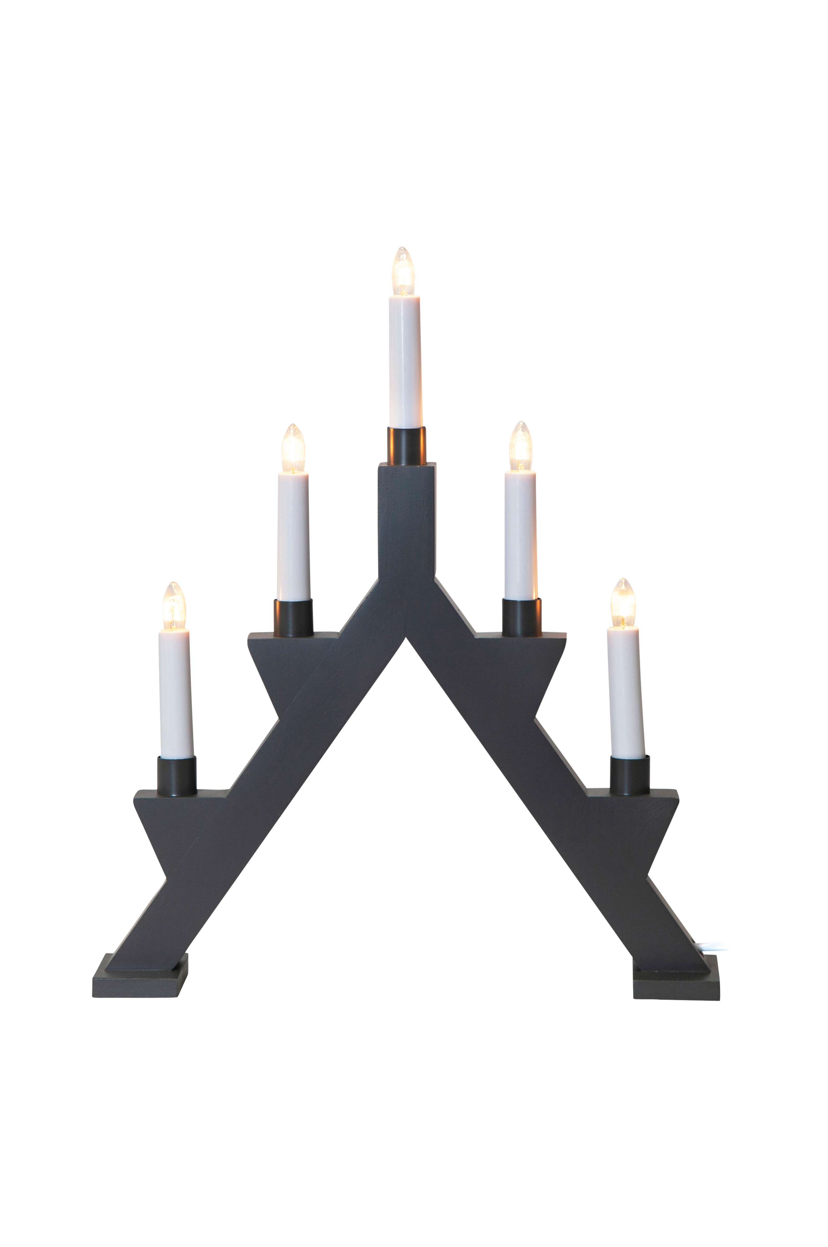 Lysestage i traditionel form med moderne udtryk. Matchende manchetter som dekoration på lysene. Giver et frisk look og herlig julestemning. E10-fatning, pærer medfølger. Hvid ledning, 180 cm. Højde 41 cm, bredde/længde 34 cm og dybde 7 cm.