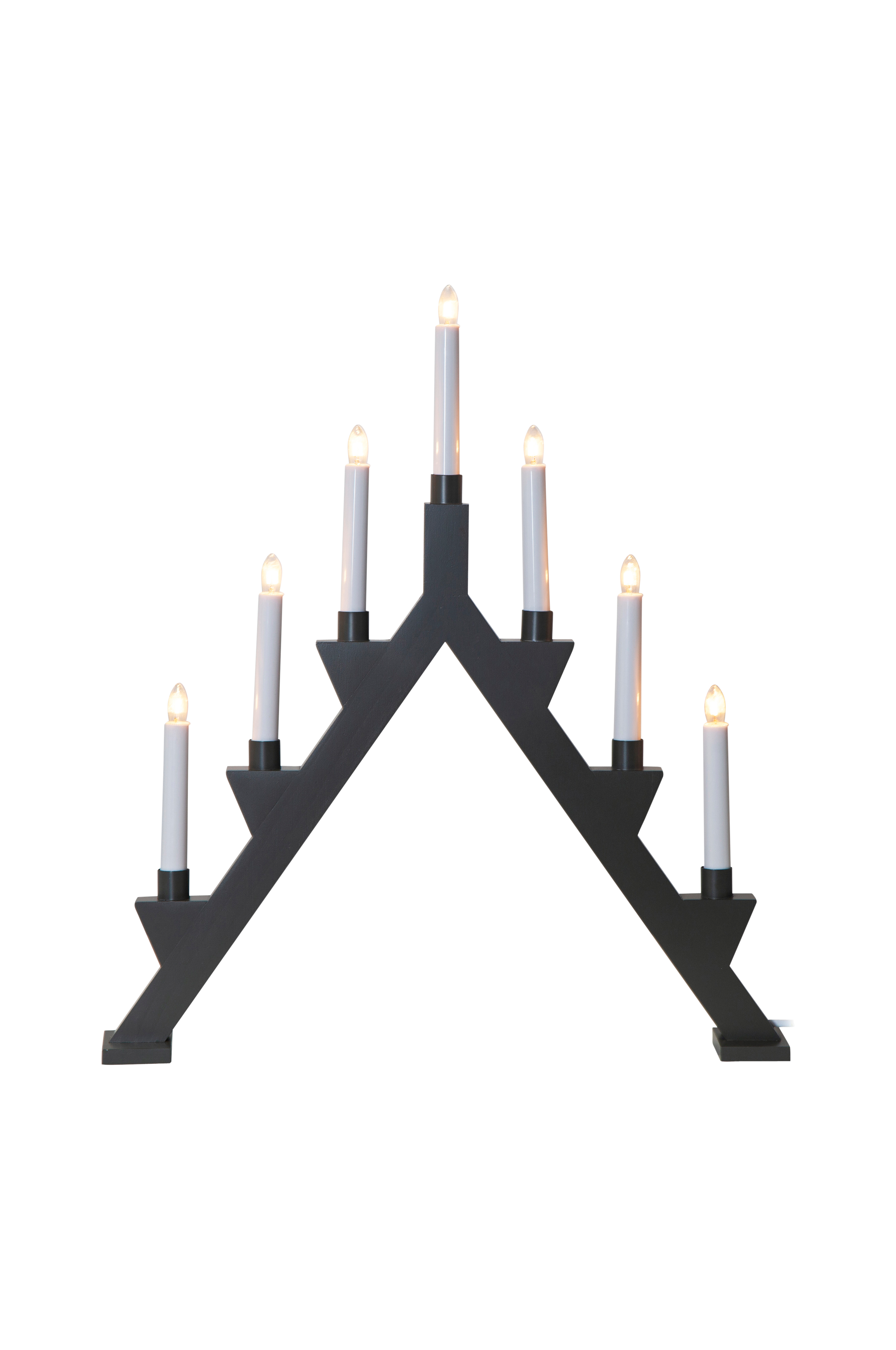 Lysestage i traditionel form med moderne udtryk. Matchende manchetter som dekoration på lysene. Giver et frisk look og herlig julestemning. E10-fatning, pærer medfølger. Hvid ledning, 180 cm. Højde 53 cm, bredde/længde 47 cm og dybde 7 cm.