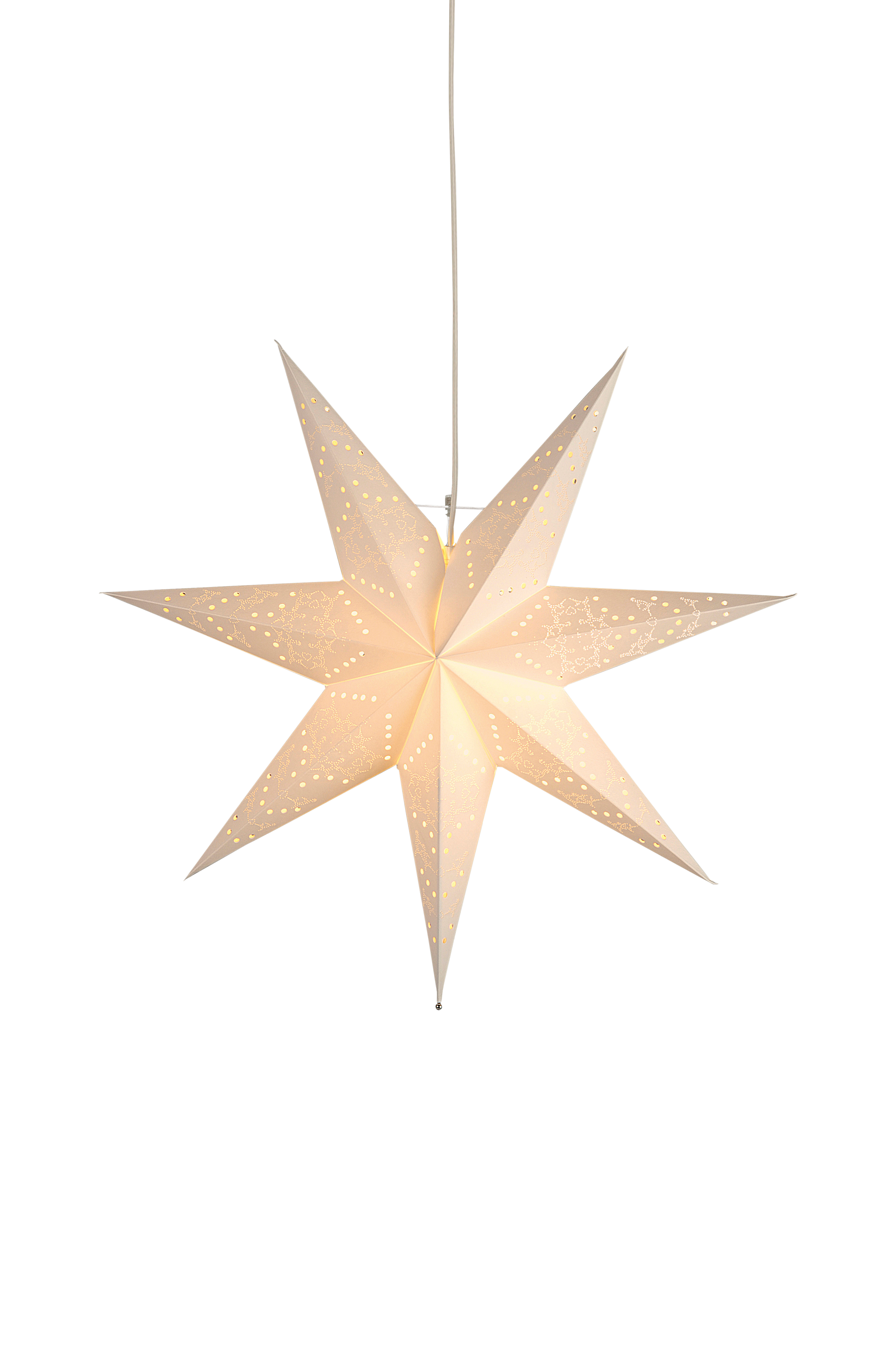 Mønstret papirstjerne i hvidt design En dekorativ stjerne til ophængning i vinduet. Højde 51 cm, bredde/længde 54 cm og dybde 16 cm. E14-fatning, pærer medfølger ikke. Hvid ledning, 350 cm. Maks. effekt 25W.