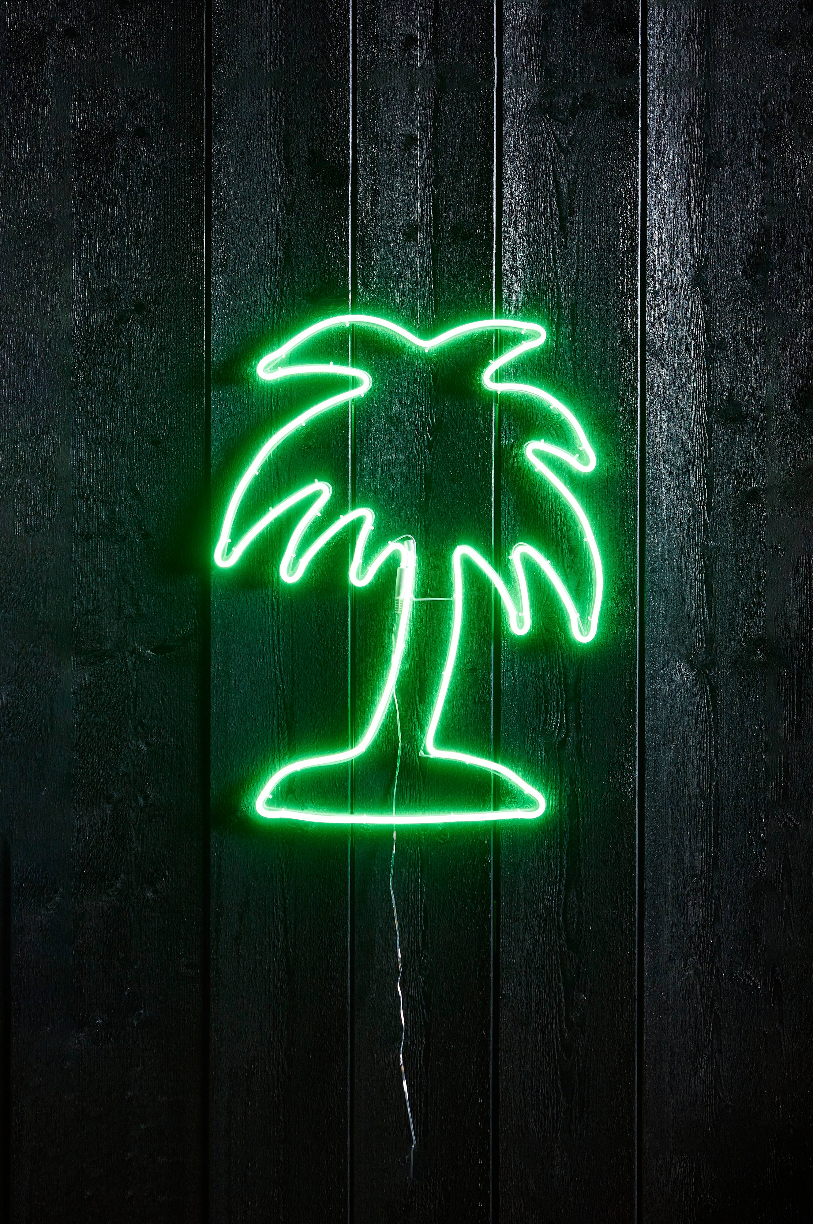 LED vægdekoration formet som en palme til udendørs brug. En skøn dekoration som passer perfekt til sommerfesten. Lyskæden har 384 lyskilder, der spreder et grønt skær. Transparent tilslutningskabel, ledningslængde 5 m.