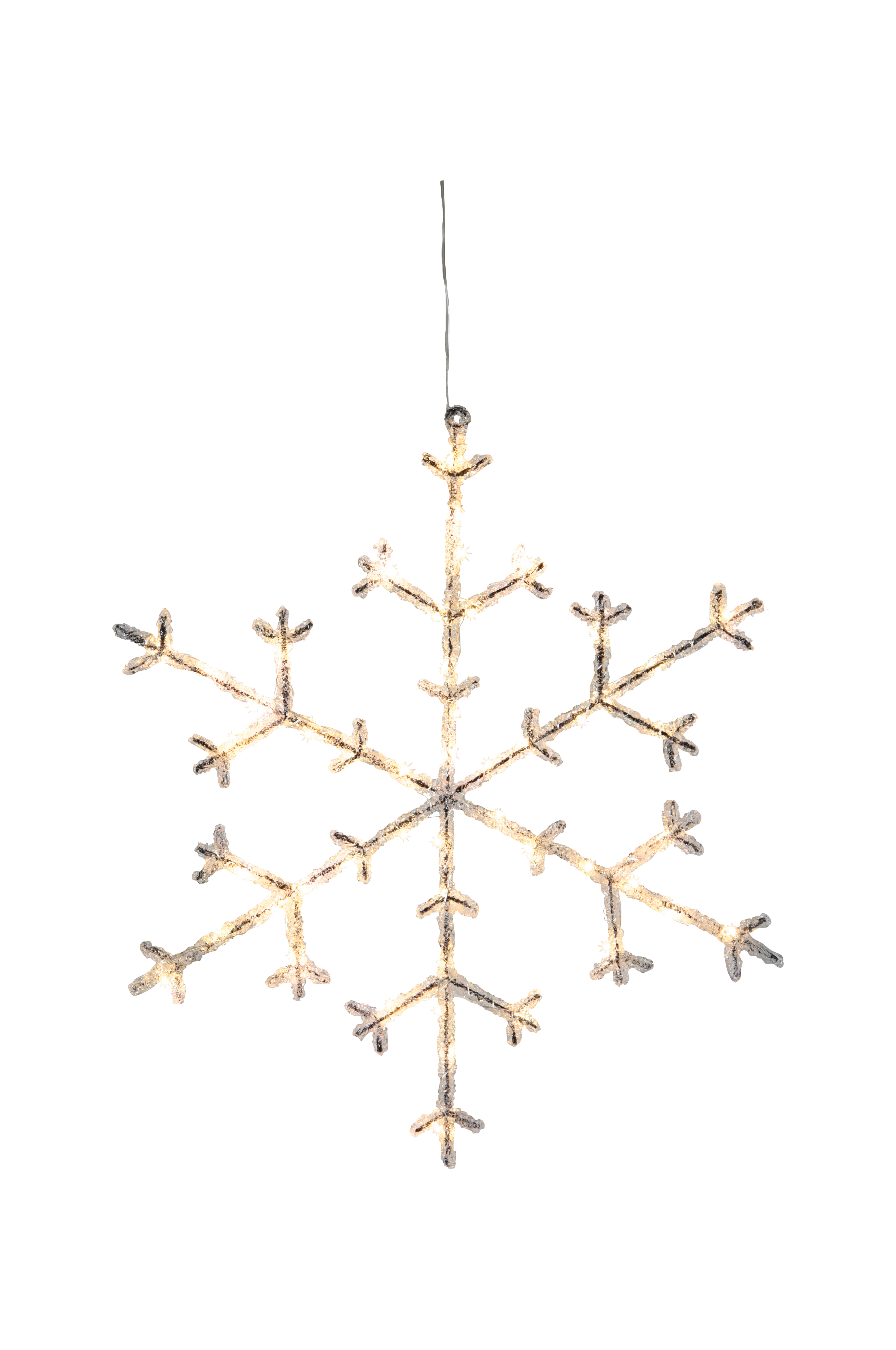 Sød dekorationsfigur i form af et snefnug. Dekorationen er 47 cm høj og har 50 små LED-pærer, som giver et varmt hvidt skær. Fin dekoration som giver et hyggeligt lys indenfor.