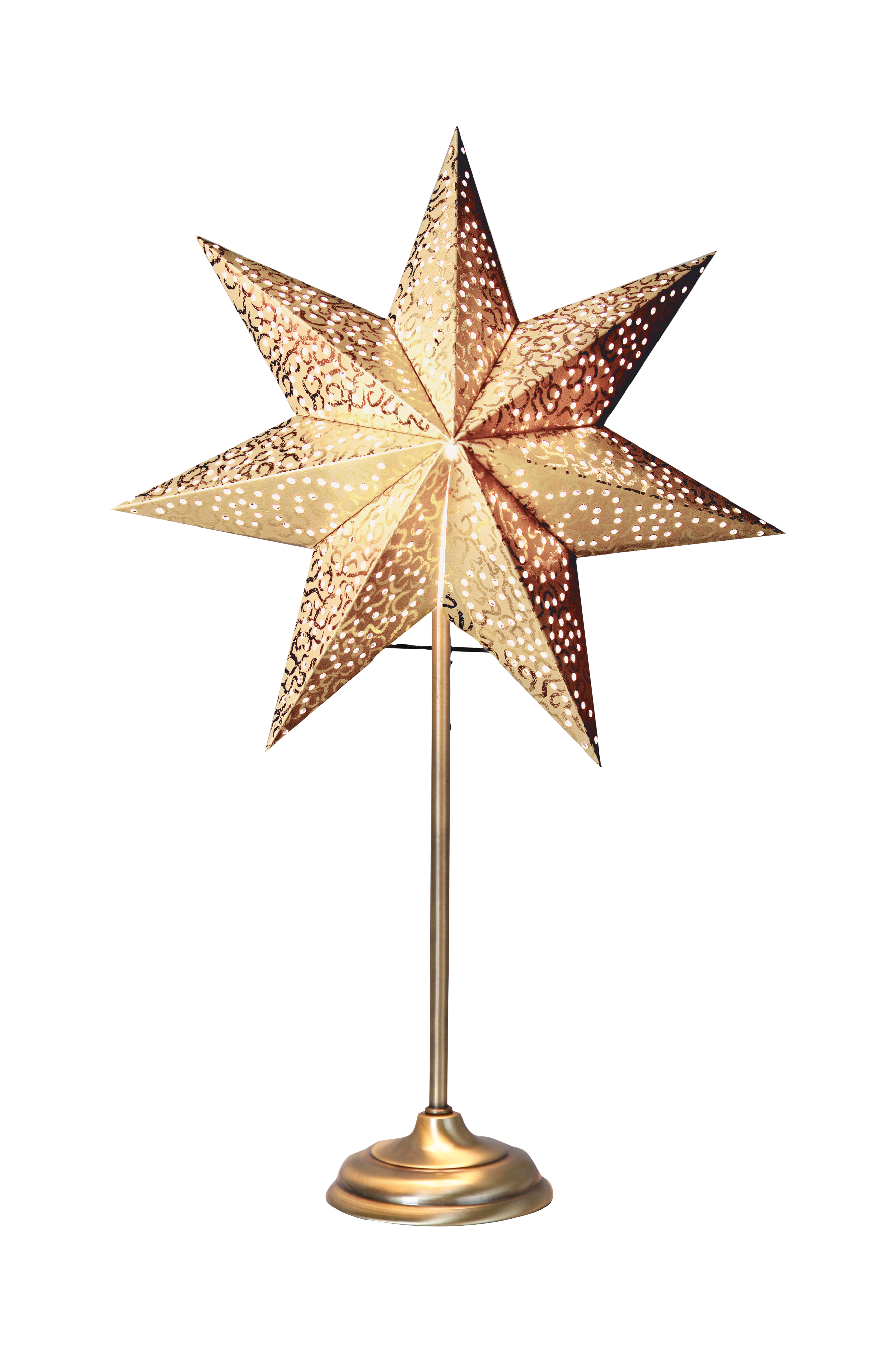 Antik ministjerne på fod i farven guld. Stjernen er smukt mønstret og er flot i et vindue. Spreder en hyggelig julestemning i hjemmet.