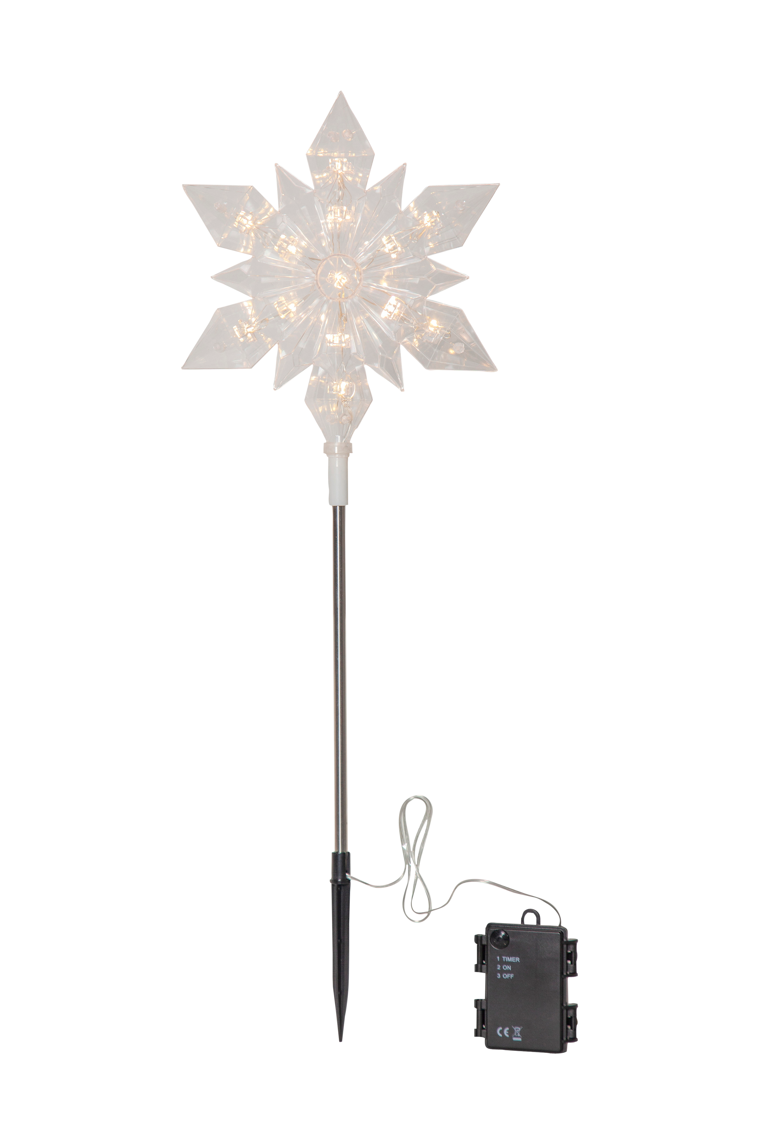 Udendørsdekoration i form af et snefnug med jordspyd. Snefnugget er lavet af gennemsigtig plast med 13 varmhvide lysdioder. Nemt at placere i en krukke eller i jorden. Batteridrevet med timerfunktion.