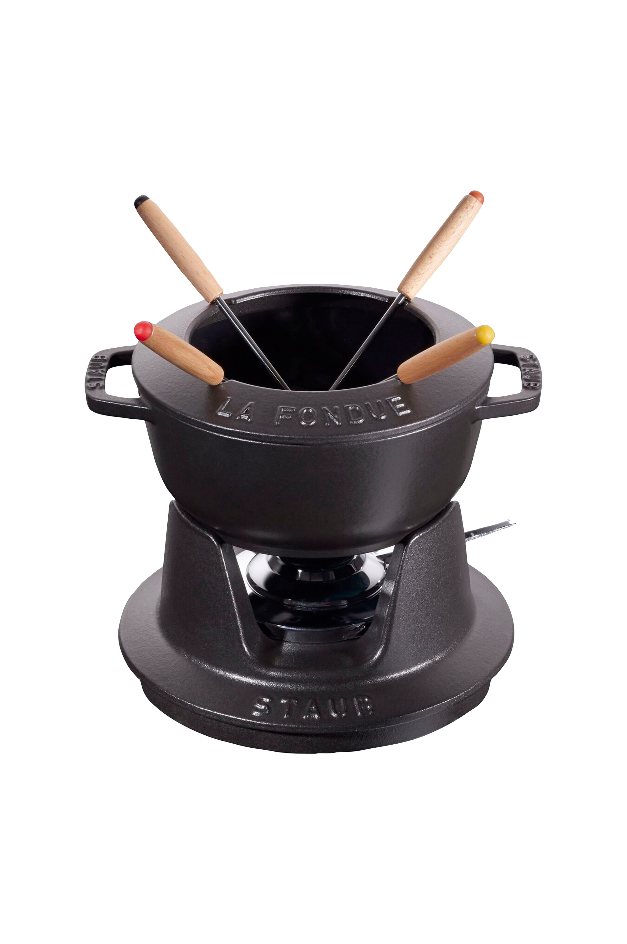 Fonduesættet kombinerer en klassisk tilberedningsmetode med alle fordelene ved robust støbejern. Støbejernets fremragende varmeegenskaber gør, at kogevæsken opvarmes hurtigt og jævnt, og at den forbliver varm i lang tid. Opvarmes gryden på komfuret i stedet for over brænderen, kan den så nemt transporteres med grydelapper, takket være de ergonomiske håndtag, og stilles på et passende underlag på spisebordet. Den aftagelige gaffelholder er også en beskyttelse mod oliestænk til bord og tøj. Takket være den glatte, emaljerede inderside klistrer maden ikke fast, og resterne kan nemt fjernes. Til sidst kan brænderen stilles på hovedet i gryden og sættet kan opbevares uden at fylde for meget.