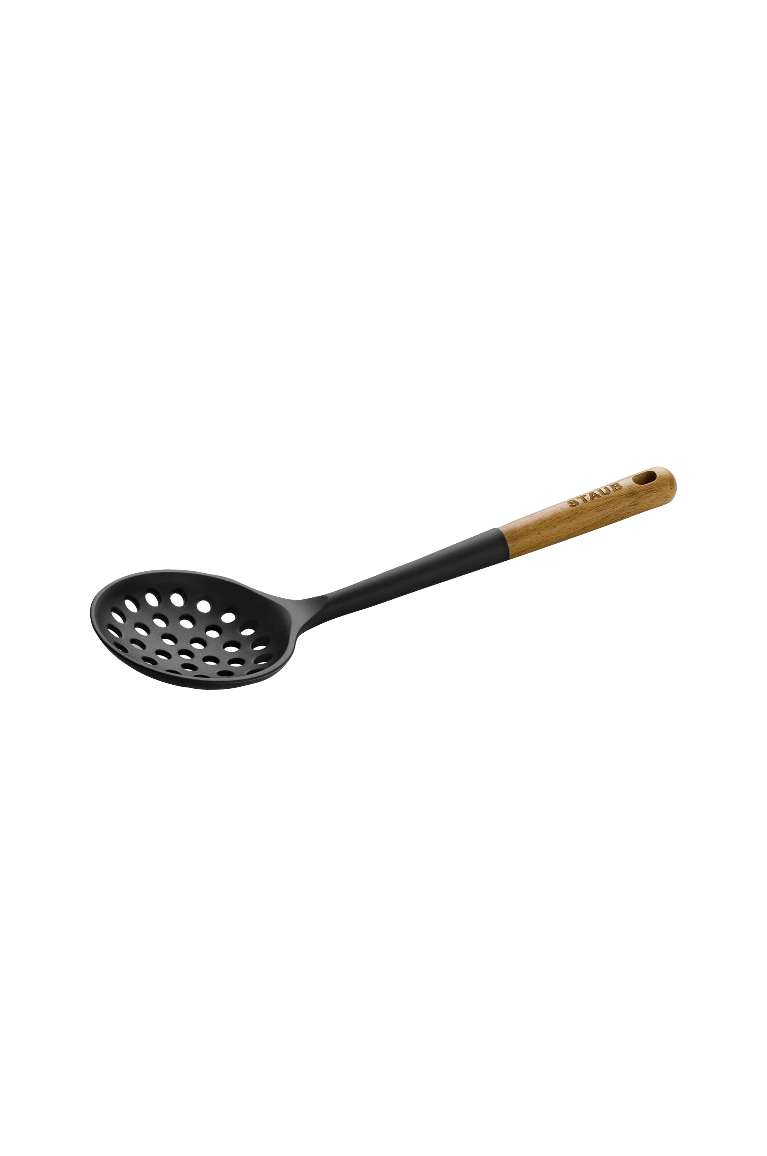 Hulskeen er det perfekte redskab til at løfte dumplings eller grøntsager op af en gryde, tage kogte æg op af vandet eller pommes frites fra en fritøse. Hullerne gør at al væske kan løbe tilbage i gryde eller panden. Den er også fantastisk til at skumme fedt fra en bouillon eller suppe - hvilket virker endnu bedre, når bouillonen er afkølet og fedtet er størknet. Håndtaget er langt og lavet af akacietræ og øsen er lavet af sort, mat silikone. Velegnet til alle overflader, inklusive non-stick belægninger, ekstremt holdbar og varmebestandig op til 220 °C.