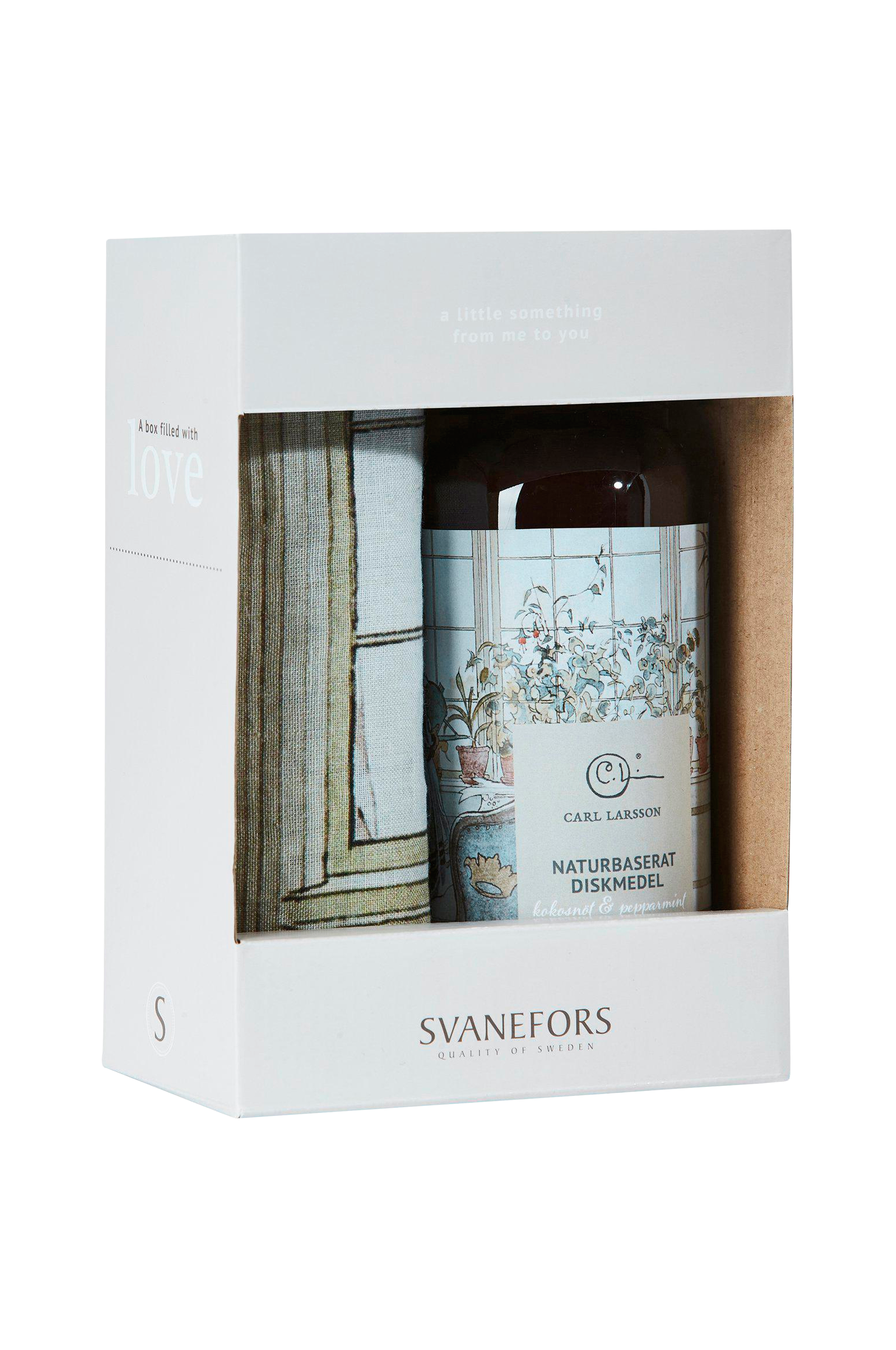 Opvaskemiddel og viskestykke i fint mønster af Carl Larsson i gavepakke. Viskestykke i smukt mønster, 100% hør som absorberer godt, 50x70 cm. Opvaskemiddel baseret på kokosolie, der skånsomt rengør uden at efterlade dine hænder tørre og røde. Indeholder også japansk pebermynte som er og har en dejlig frisk duft. Flasken indeholder 500 ml.