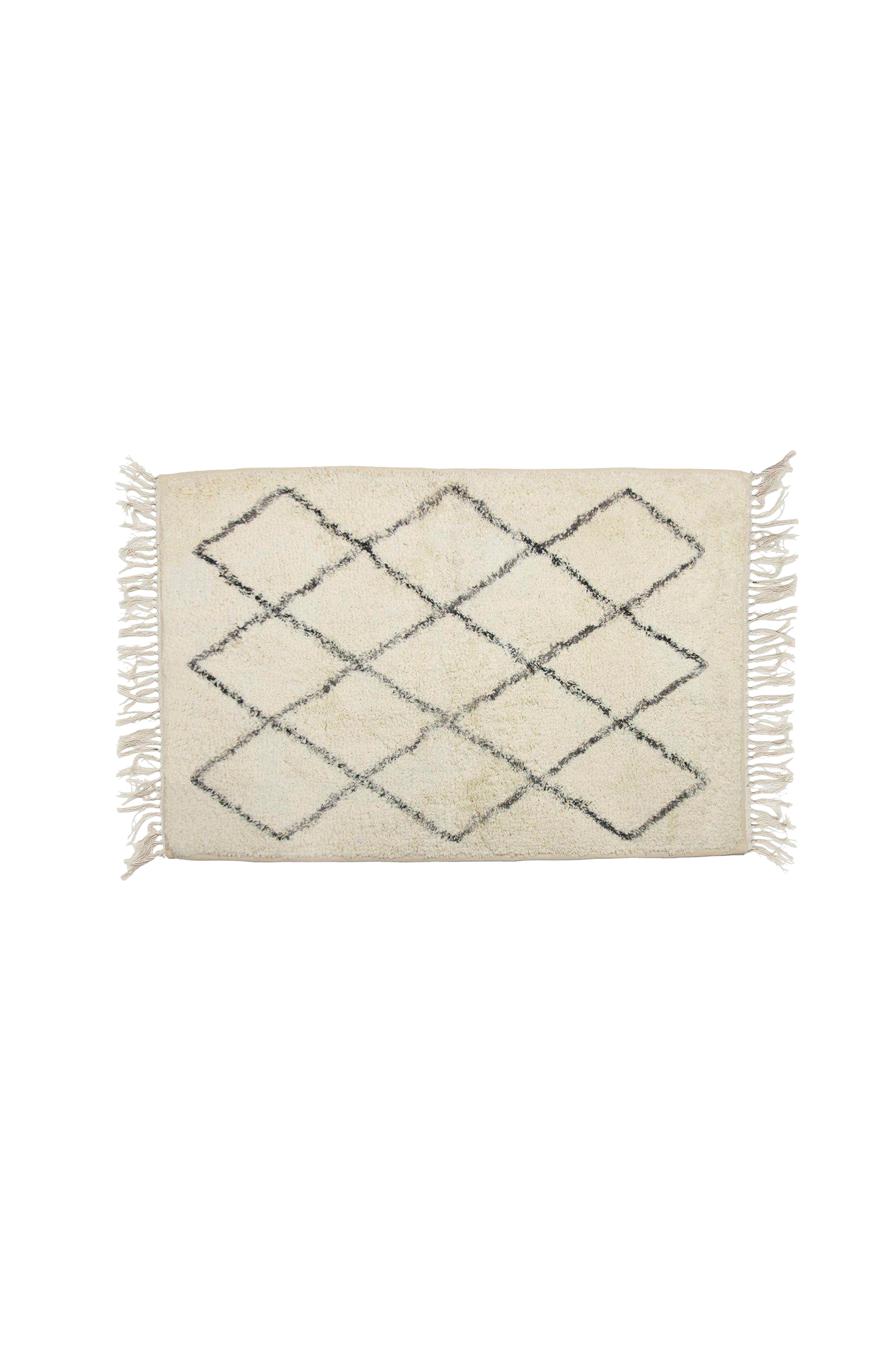 Skønt flosset tæppe med frynser i enderne og flot grafisk print. Shaggy findes i flere forskellige størrelser. Da tæppet er sammenrullet under transporten kan der forekomme folder, der forsvinder efter noget tid. Husk på at nye tæpper kan fælde i begyndelse, så vi anbefaler at du støvsuger tæppet regelmæssigt i starten for at forkorte denne proces. For at mindske risikoen for at glide i tæppet kan du købe et skridunderlag. Mål 140x 200 cm. 100% bomuld.