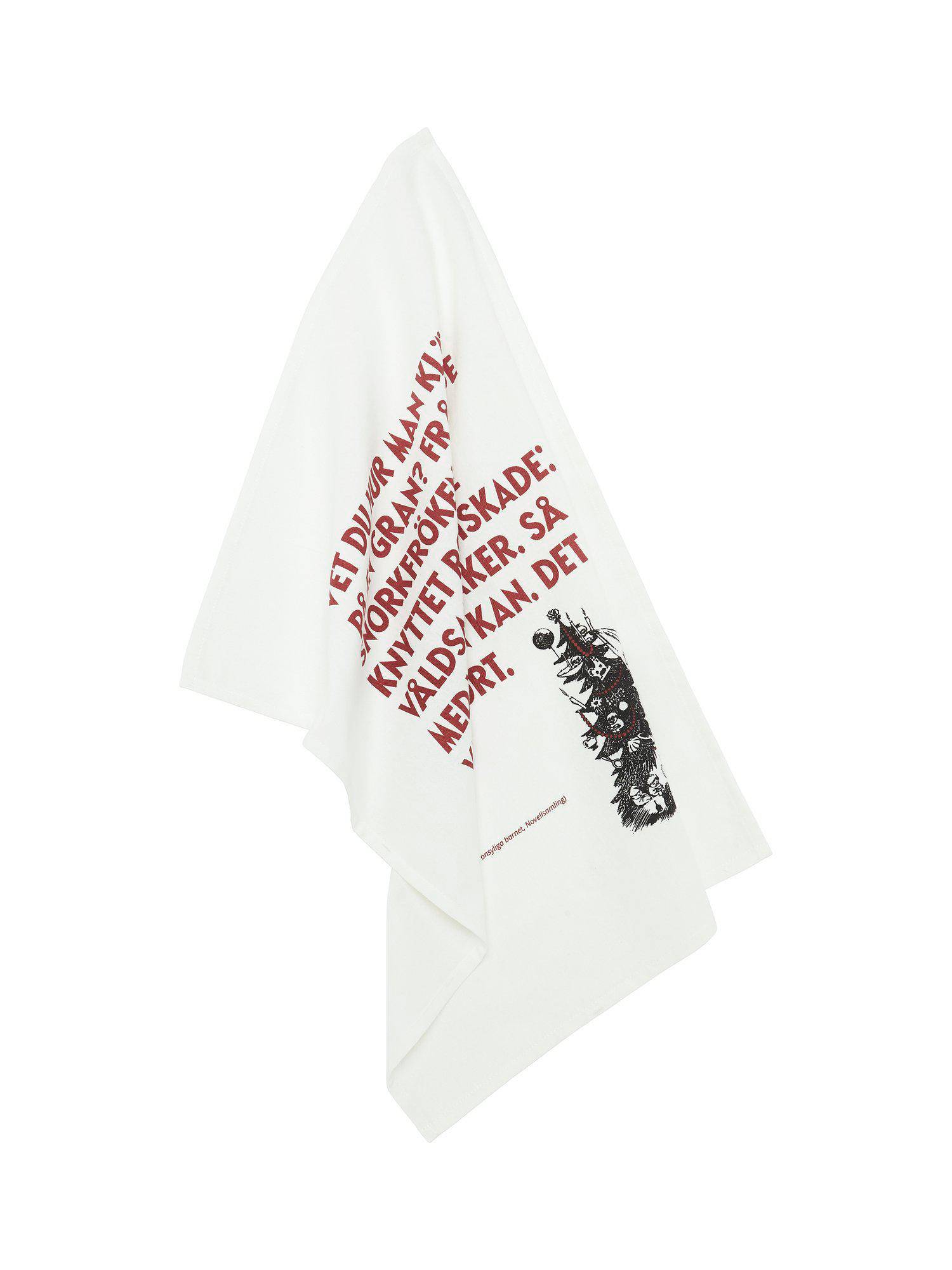 "Ved du, hvordan man pynter et juletræ? spurgte Snorkfrøknen. Knytten rødmede voldsomt og hviskede: med smukke ting. Så smukt man kan. Det har jeg hørt" Viskestykke med et citat fra novellen Det usynlige barn af Tove Jansson. Viskestykket har en strop i det ene hjørne til ophængning. 100% bomuld.