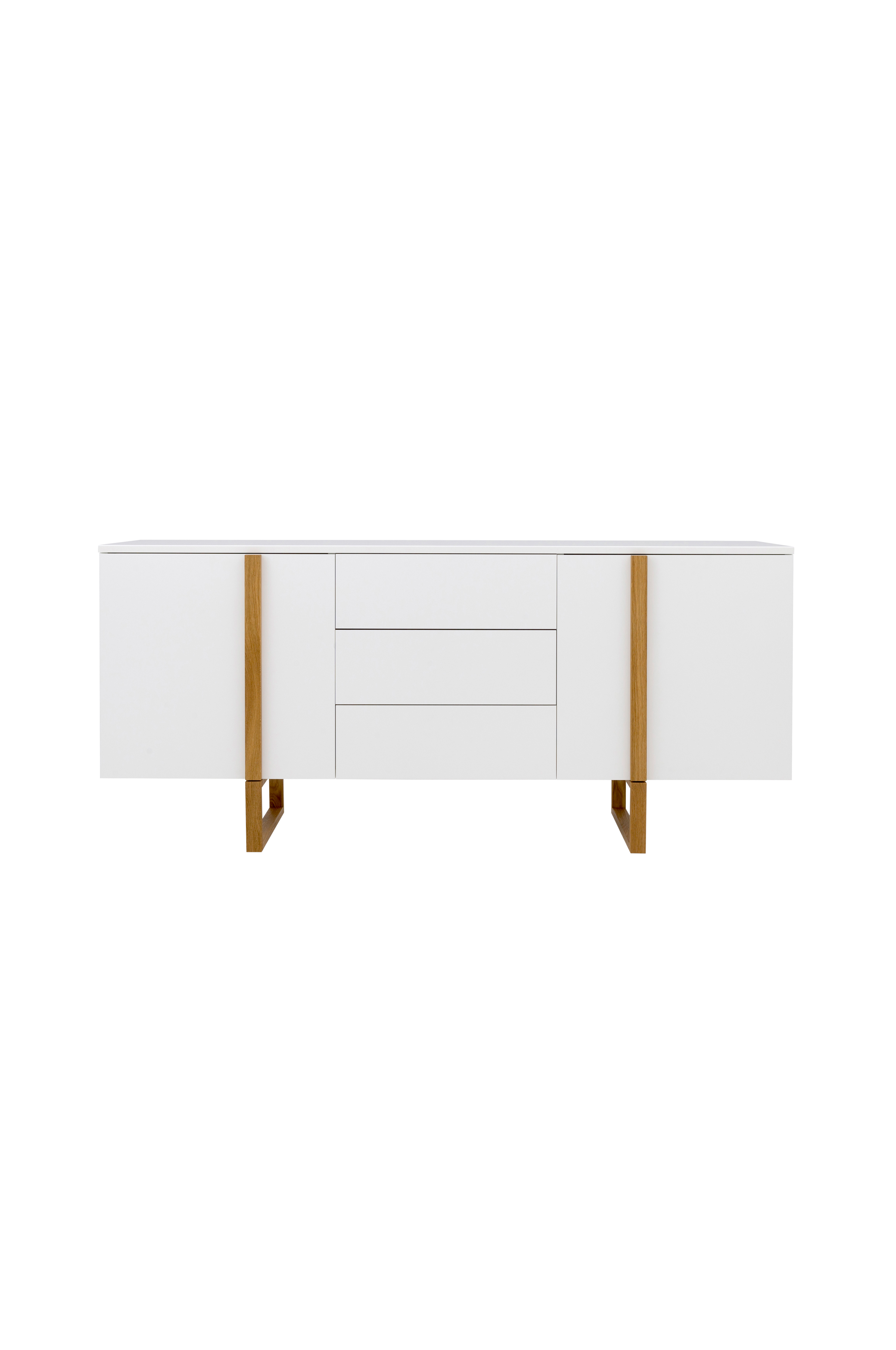 Svensk produceret. Lakeret MDF og spånplade. Greb og ben i massiv olieret eg. Møblet har 3 skuffer med push-funktion i midten, skuffefælg i egemelamin for en flot effekt, når man åbner skuffen. Låger med softclose-funktion og stor rum med justerbar hylde.