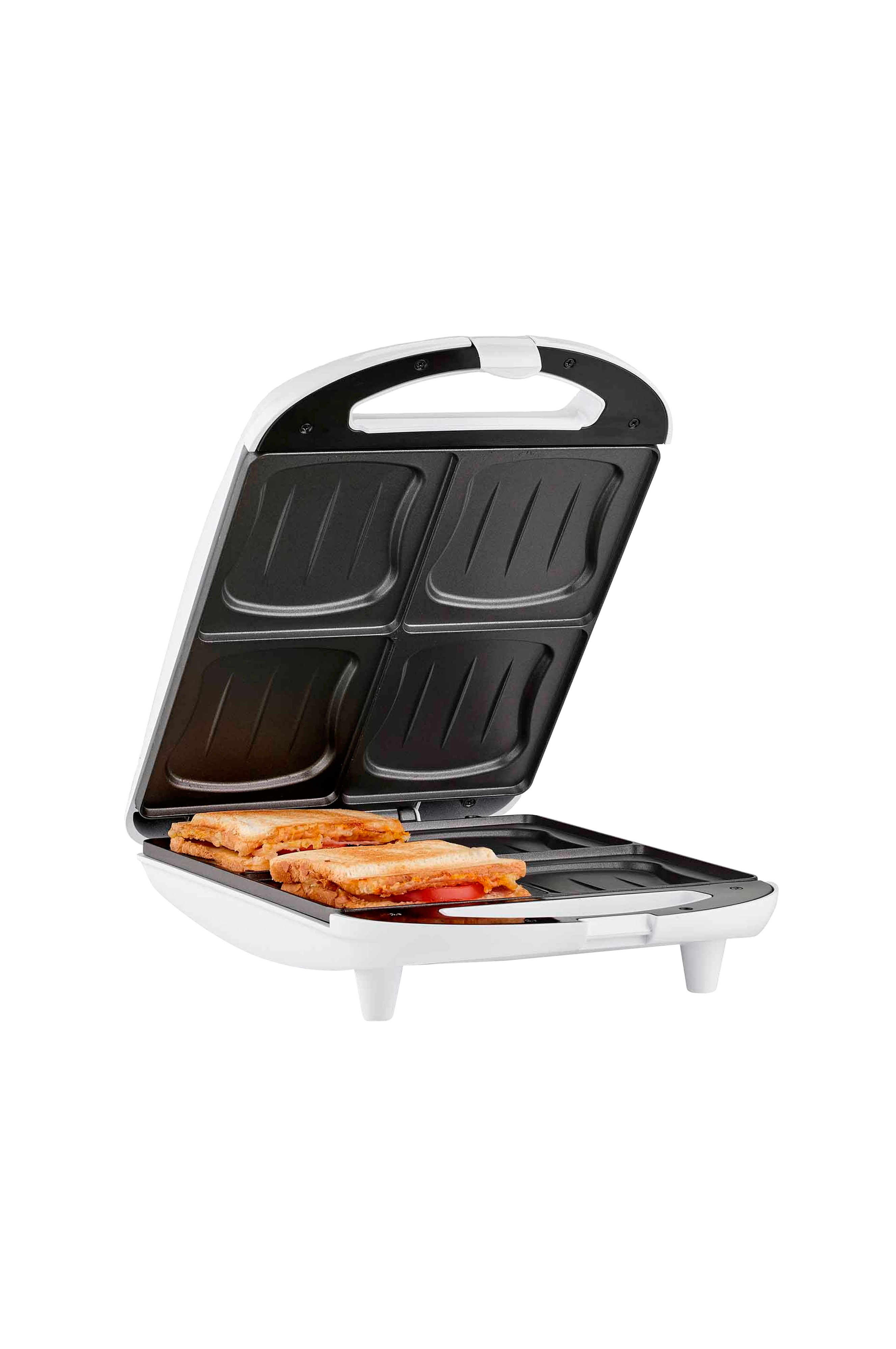 XL Toastmaskine til at lave fire ristede sandwicher på samme tid. Med automatisk termostat og indikering, når de er færdige, og plader med muslingeformede fordybninger med nonstick-belægning for enkel rengøring.