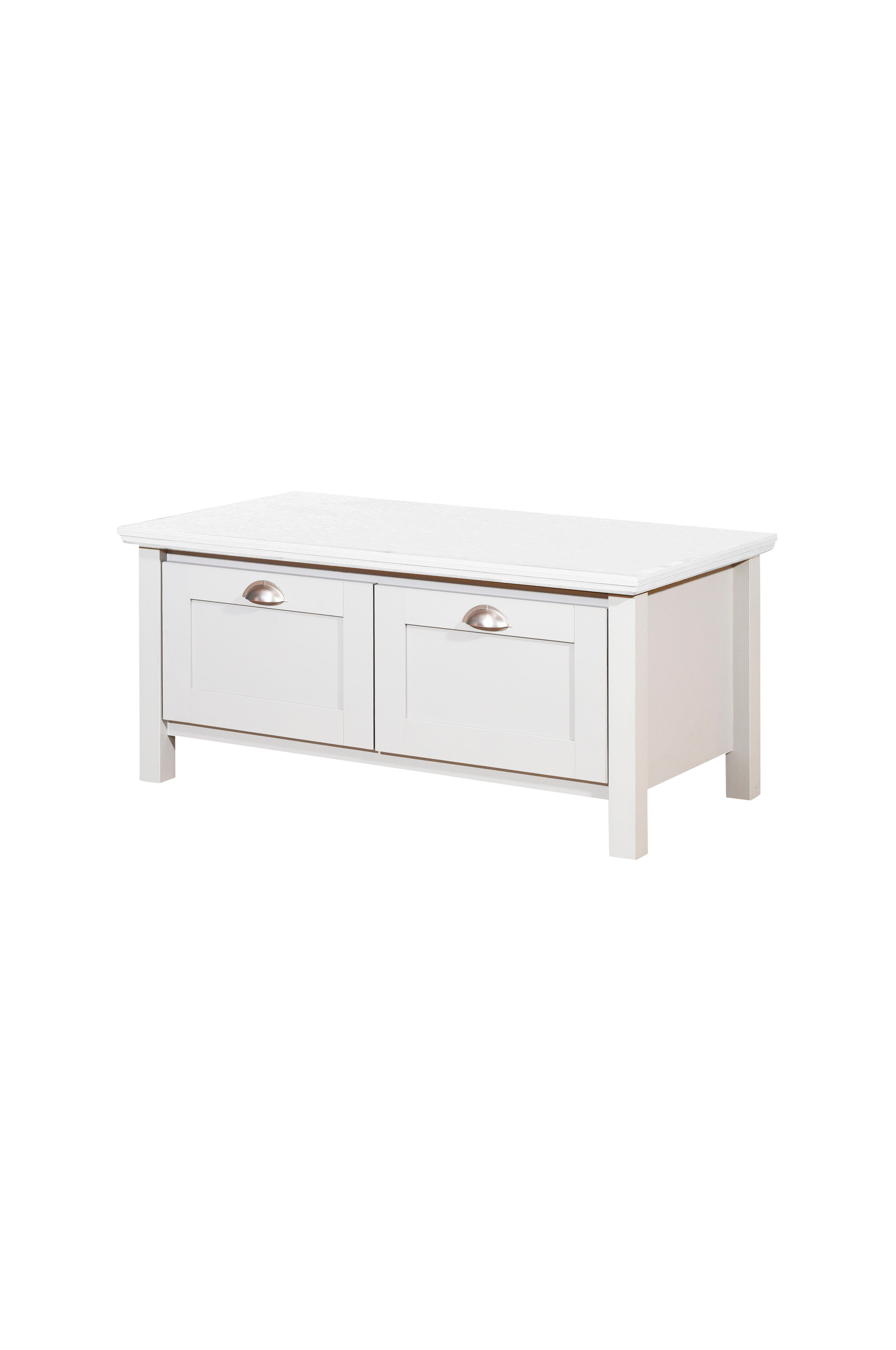 Denne bænk leveres usamlet, men der medfølger en god samlevejledning. Inde i skaber er det meget plads til mange ting. Lågefronterne har flotte håndtag i købmandsdiskstil og materialet er MDF-plader, der er lakeret.