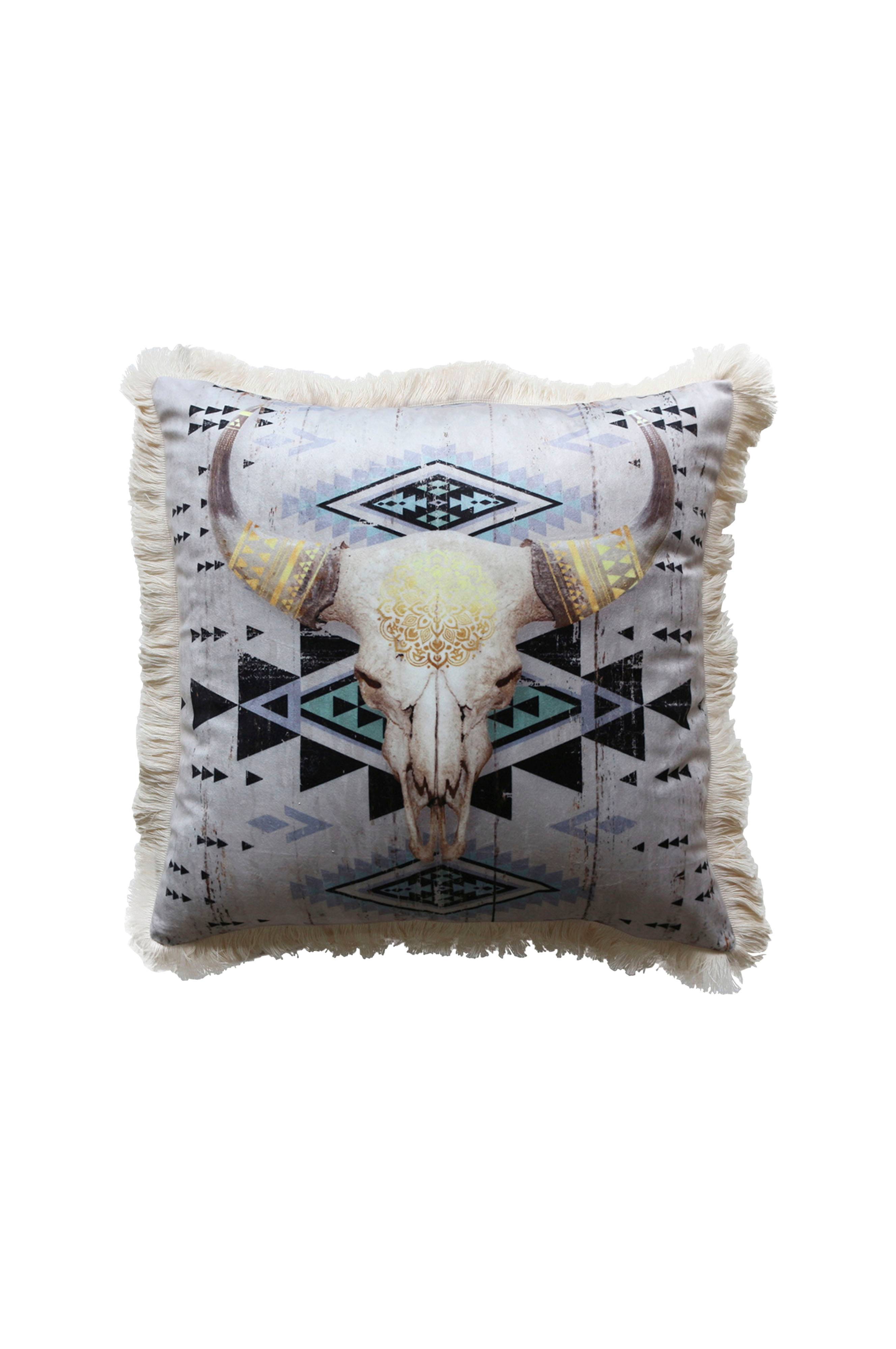 Her er noget for dem, der vil have en lidt anderledes pude, med et sejt oksehoved, der er også nogle fine farvenuancer i den.