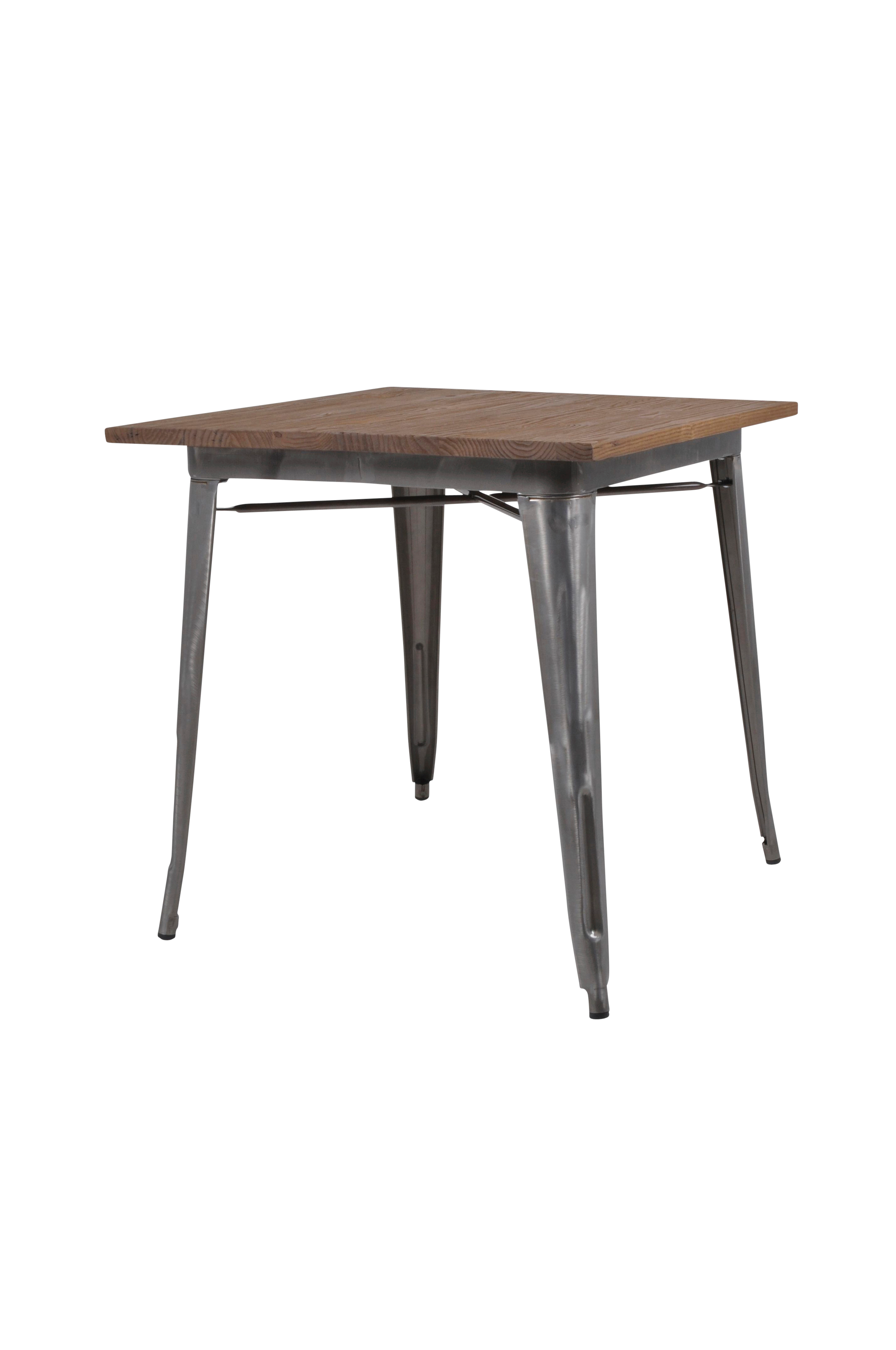 Franskinspireret bord i galvaniseret metal. Bordplade i rustik, rå mørkebrun elm.