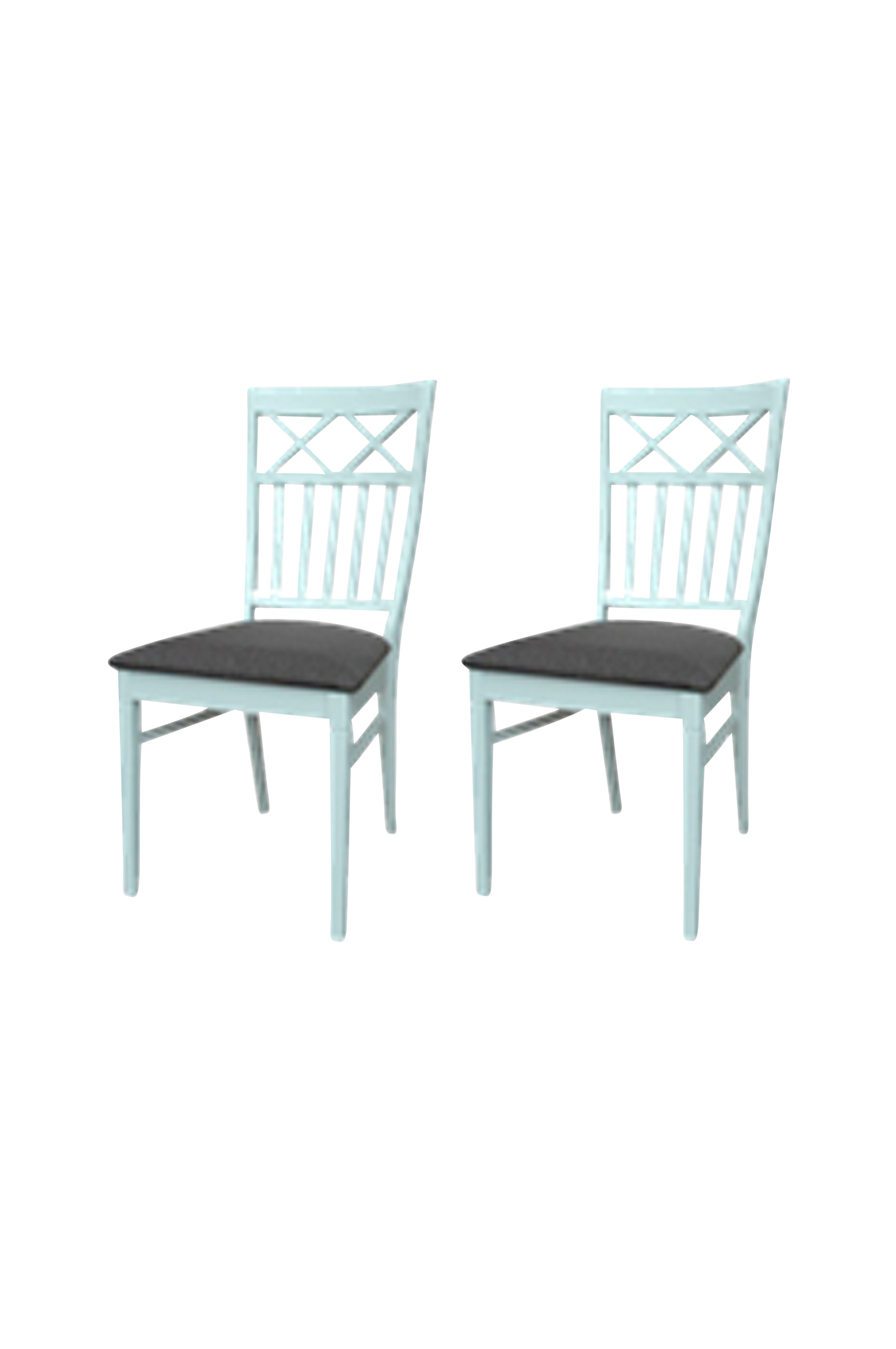 Disse stole med 2 små x på ryglænet passer godt både i køkken og spisestue. De er lakeret i NC lak som gør at overfladen bliver robust. Der medfølger 2 hvide træsæder.
