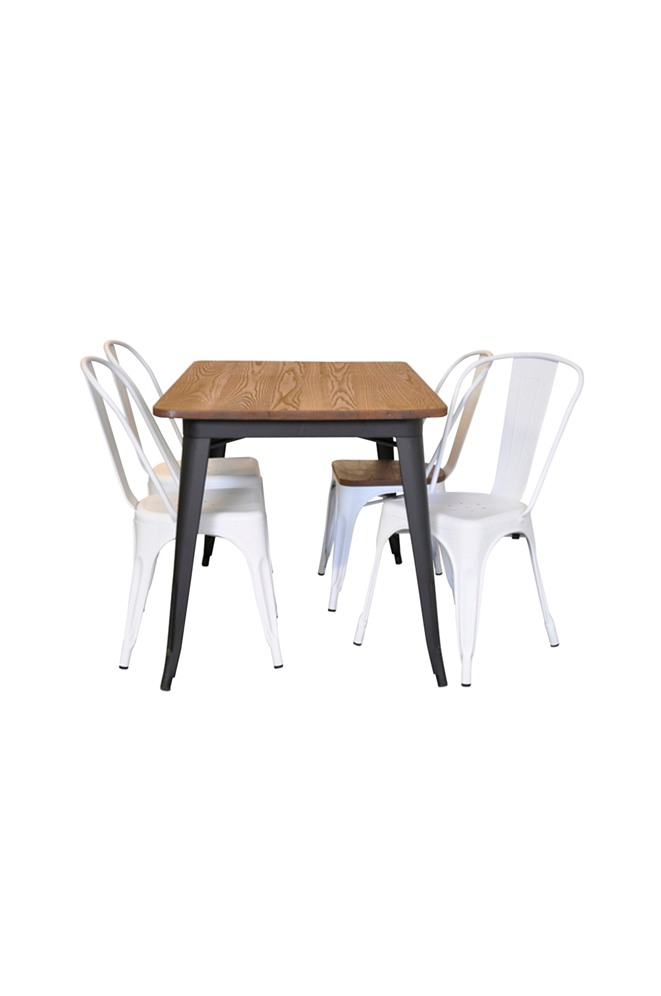 Dette franskinspirerede sæt består af et bord med en plade i rustik, rå farve. Der medfølger 4 metalstole.