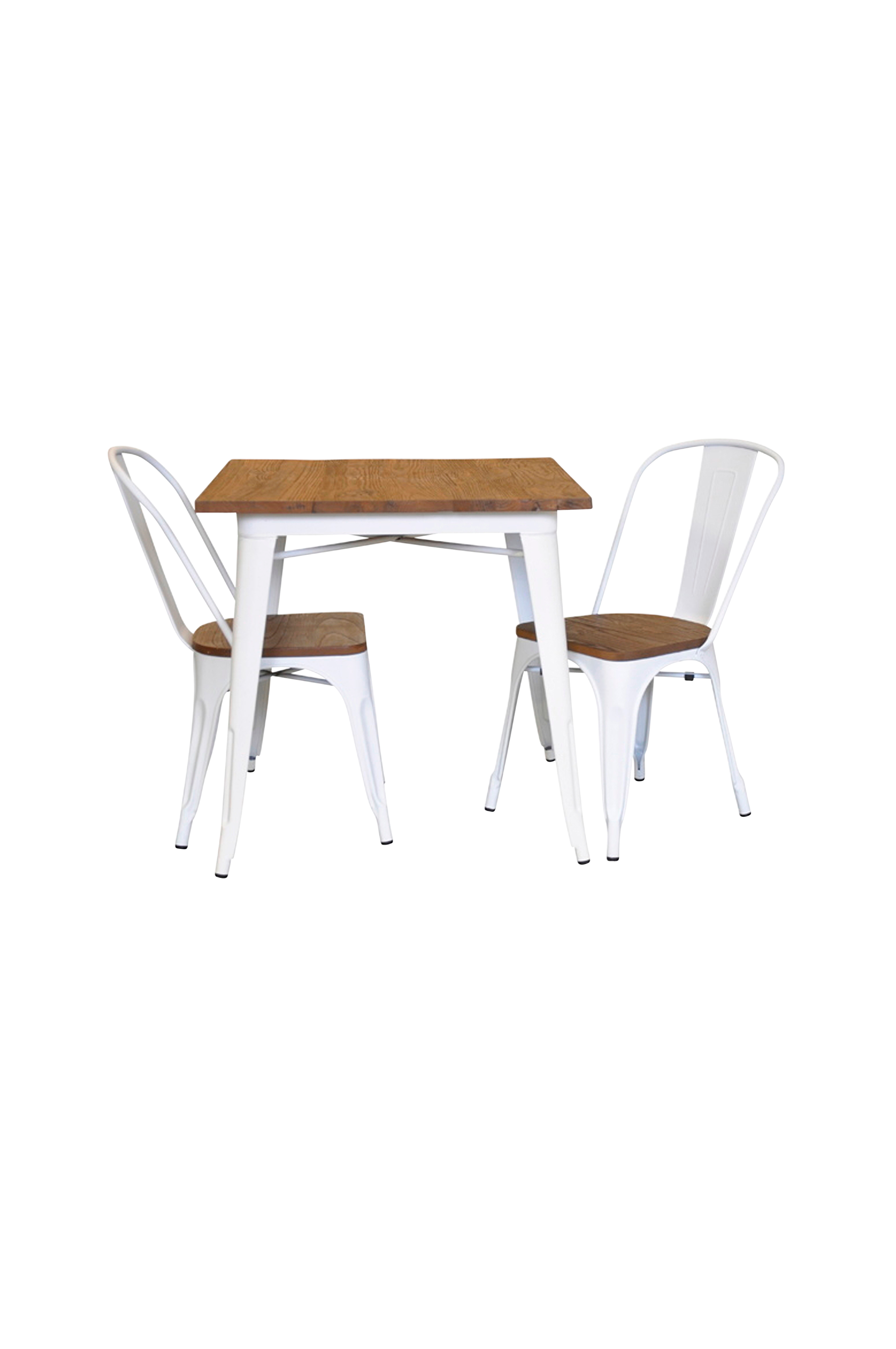 Dette franskinspirerede sæt består af et bord med en plade i rustik, rå farve. Der medfølger 2 metalstole.