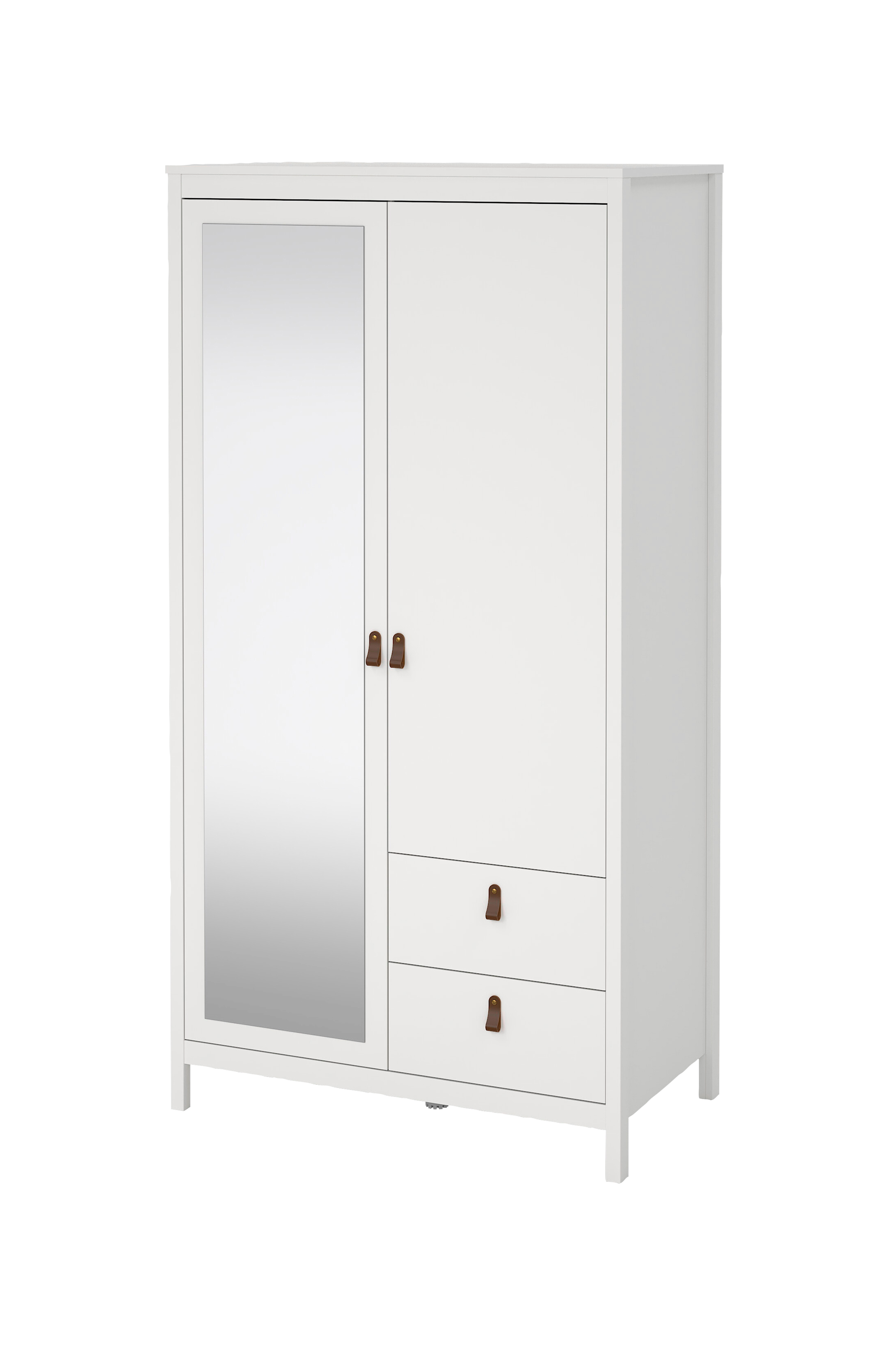 Madrid-garderoben er moderne, elegant og alsidig. Det har to døre, den ene med spejl, to skuffer, to faste hylder, tre justerbare hylder og en bøjlestang - alt sammen designet med præcision til at løfte dine opbevaringsbehov. Der medfølger to håndtag, et i læder og et med knop, så du kan justere udseendet.
