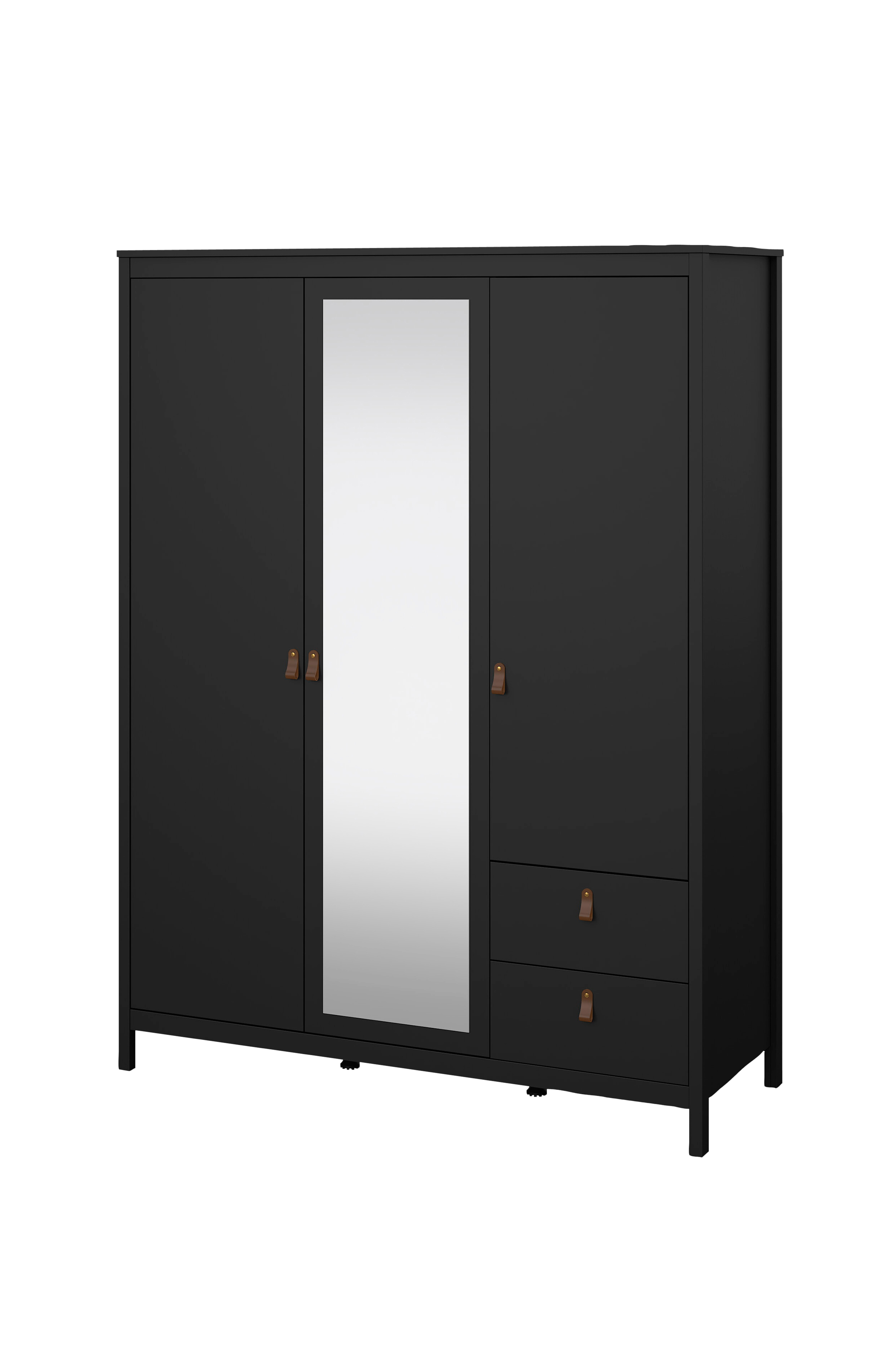 Madrid-garderoben er moderne, elegant og alsidig. Det har tre døre, en med spejl, to skuffer, to faste hylder, tre justerbare hylder og en bøjlestang - alt sammen designet med præcision til at løfte dine opbevaringsbehov. Der medfølger to håndtag, et i læder og et med knop, til at justere looket.