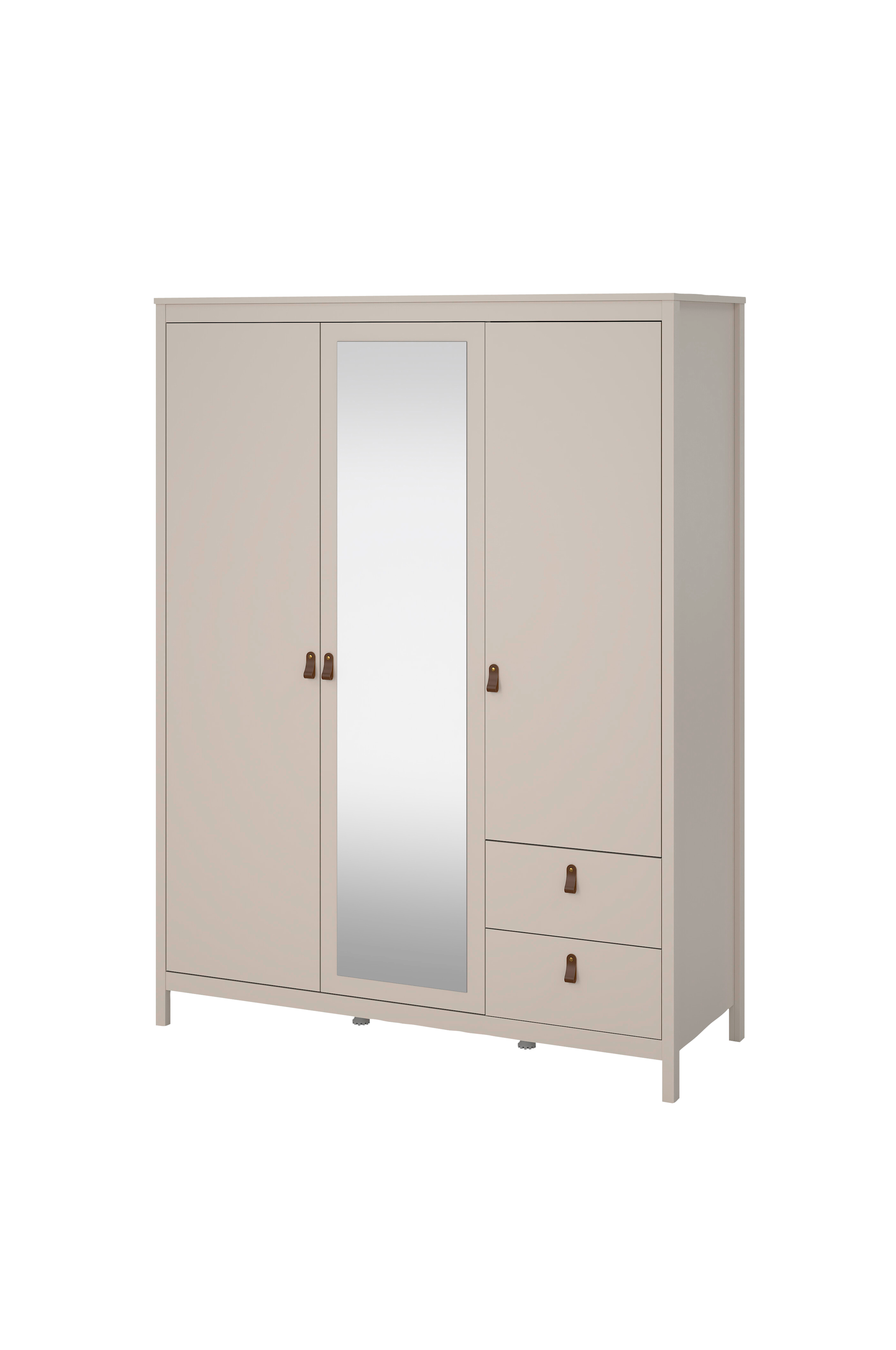 Madrid-garderoben er moderne, elegant og alsidig. Det har tre døre, en med spejl, to skuffer, to faste hylder, tre justerbare hylder og en bøjlestang - alt sammen designet med præcision til at løfte dine opbevaringsbehov. Der medfølger to håndtag, et i læder og et med knop, til at justere looket.